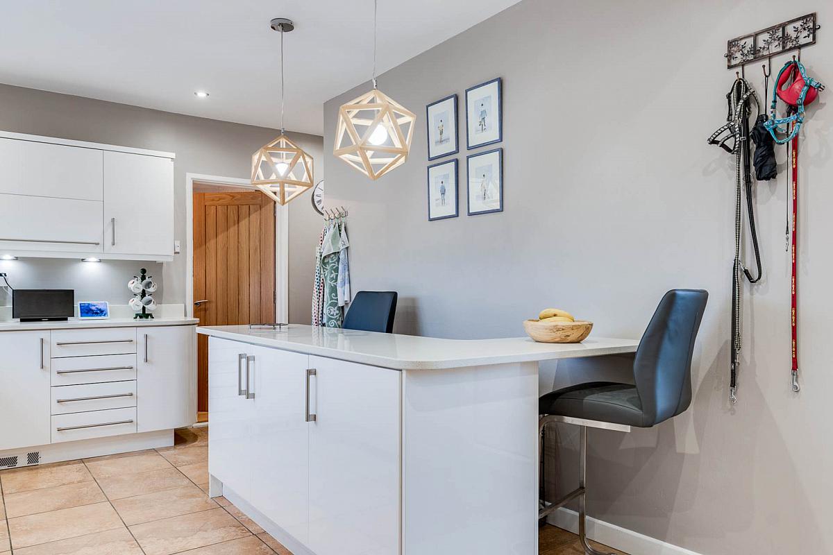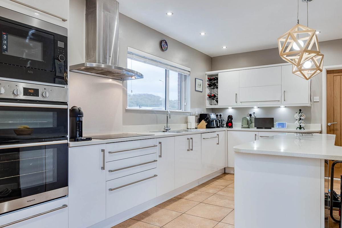 Single drainer stainless steel sink unit and mixer tap with vegetable basin. Excellent range of high and low-level white high gloss units with quartz worktops and up stands. AEG integrated microwave oven and Hotpoint built-in double oven. Neff four ring induction hob unit. AEG stainless steel cooker hood with quartz splash back. Neff integrated dishwasher. Plumbed for American style fridge/freezer. Fitted breakfast bar. Corner unit with two tier swing trays. Fitted wine rack. Pull-out larder. Recessed lighting. UPVC double glazed back door. Tiled floor.