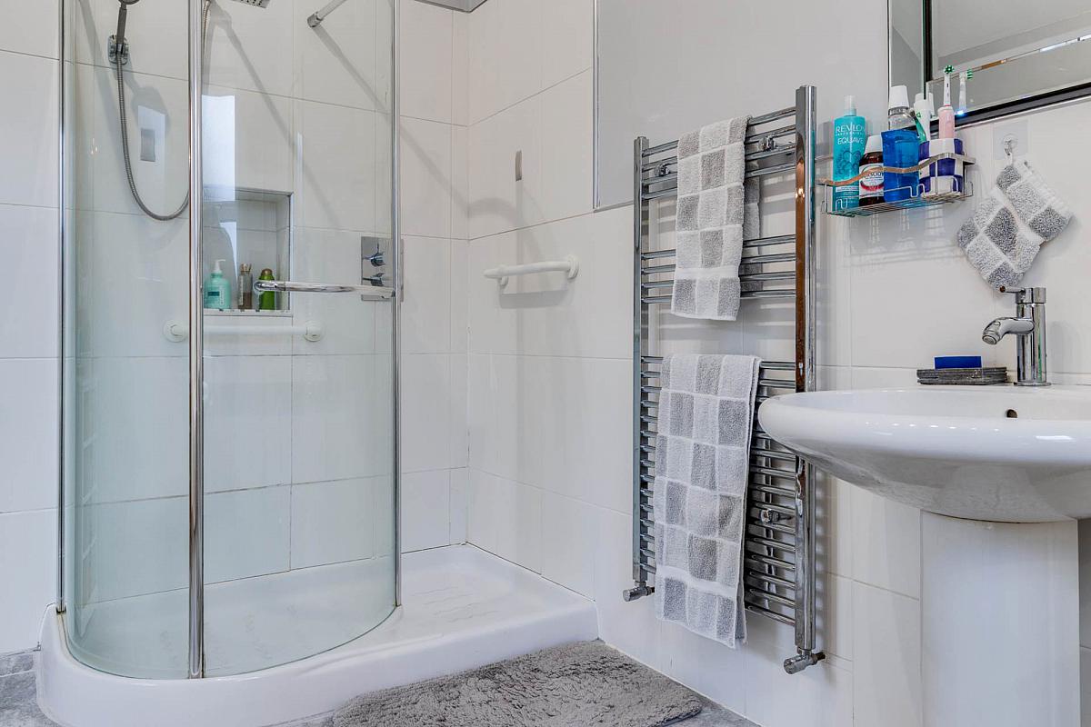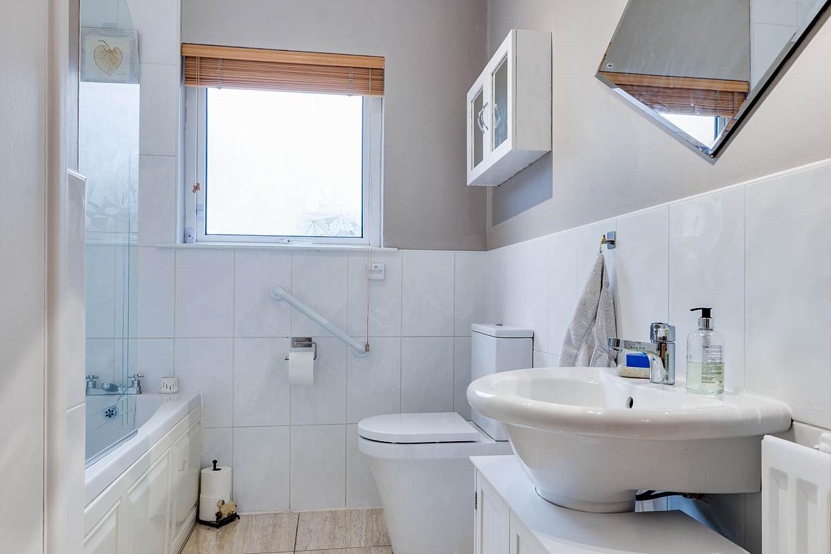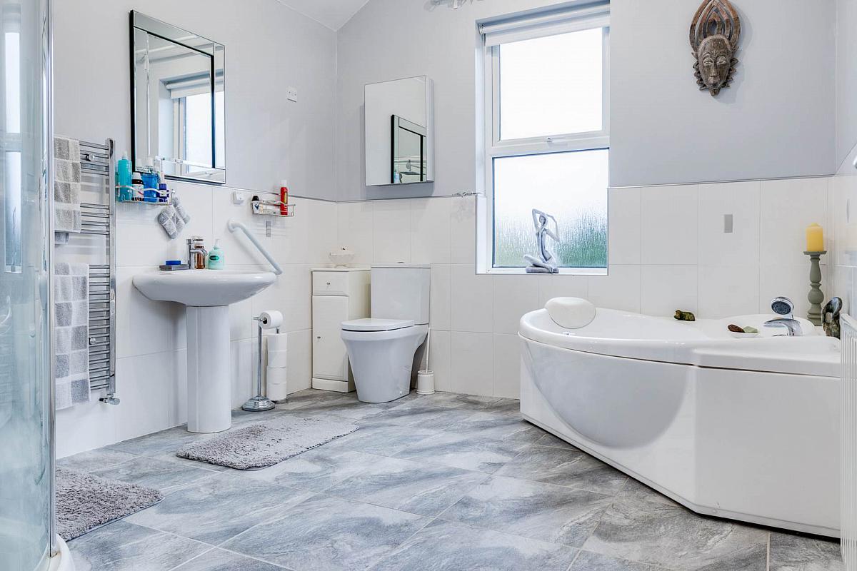 White suite comprising corner multi-jet panel bath with telephone hand shower. Low flush WC. Pedestal wash hand basin. Part tiled walls. Matching tiled shower cubicle with thermostatically controlled rainforest and hand-held shower fittings. Tiled floor.