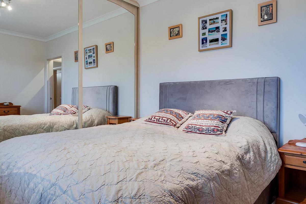 Range of wall-to-wall built-in robes with mirrored sliding doors. Cornice ceiling.