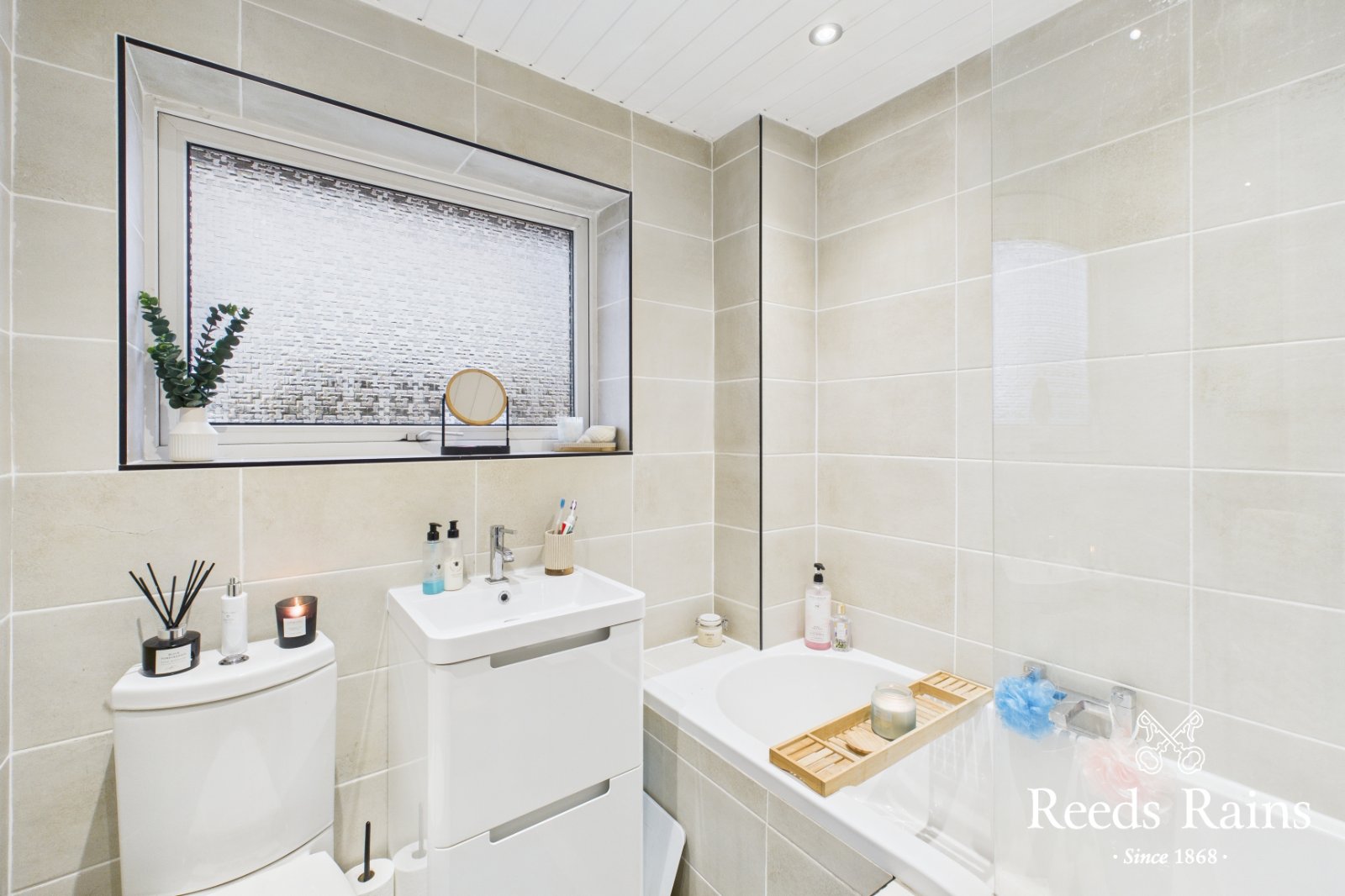 White suite comprising tiled bath with wall mounted Triton electric shower, vanity unit and low flush wc. Heated towel rai. Tiled walls. PVC strip ceiling.