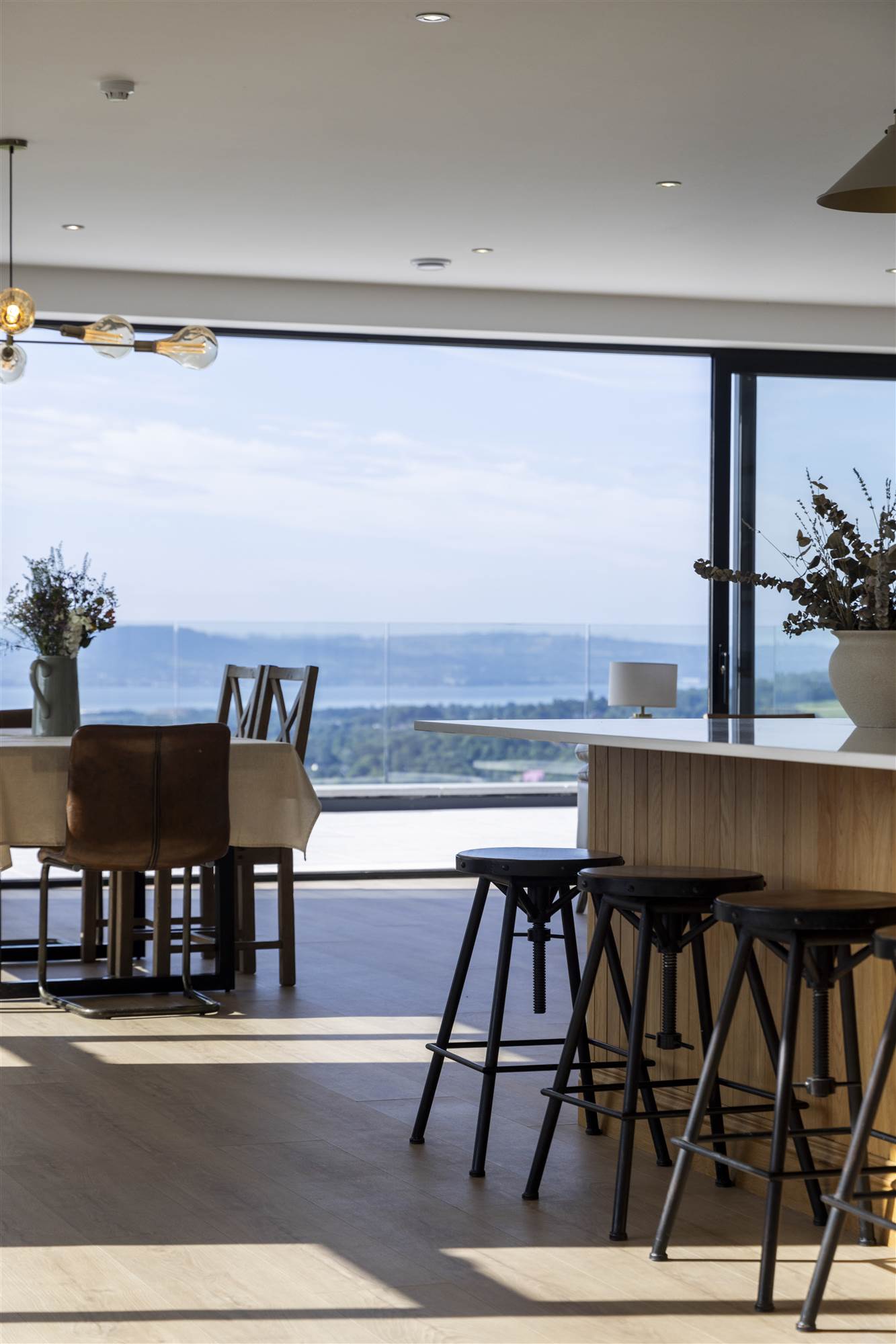 Open plan living, kitchen and dining area onto a large patio with incredible views