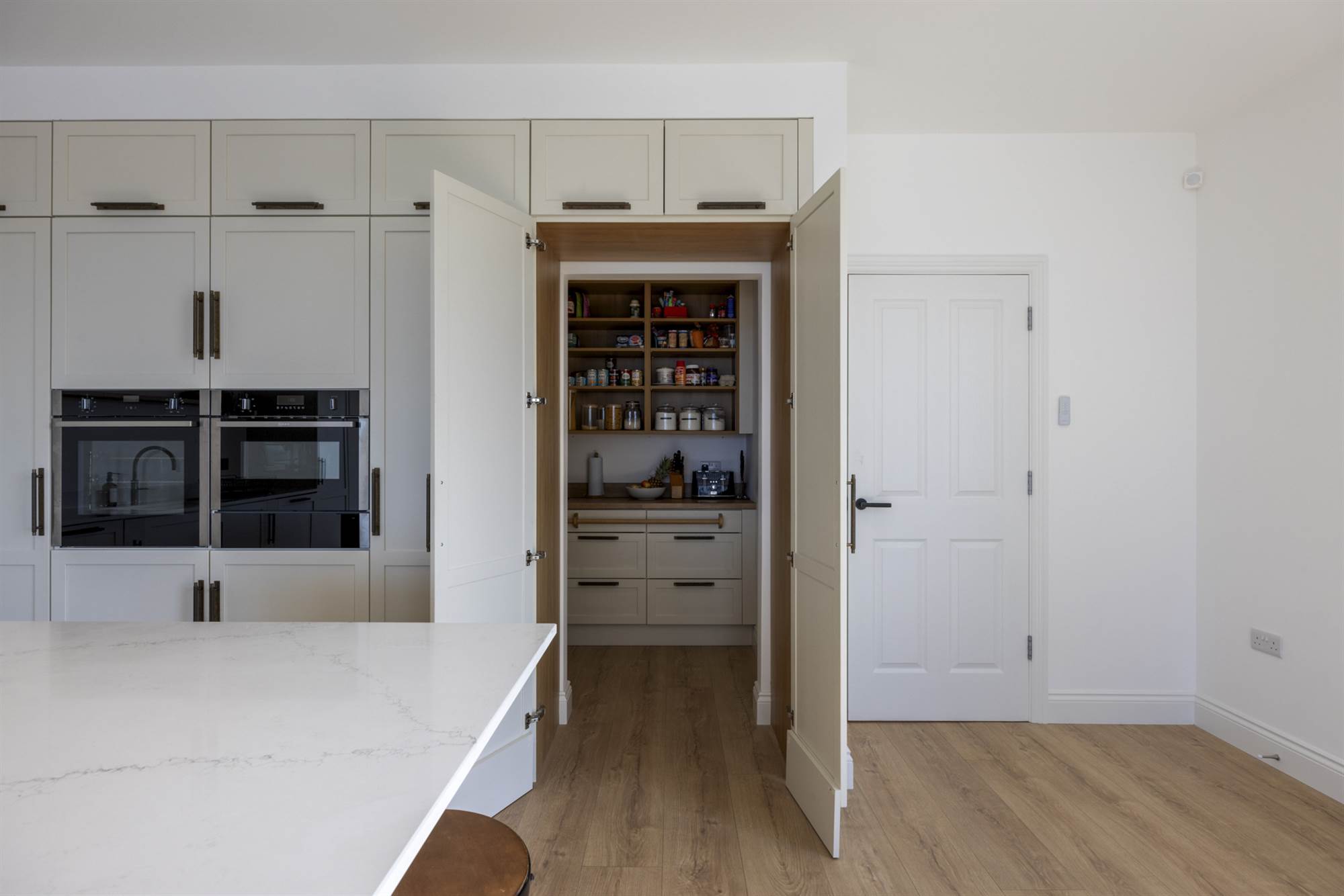 Double doors within the kitchen provide access to the hidden pantry, with automatic lighting, fully fitted out with cupboards and shelving and sliding step ladder to access the higher shelves.