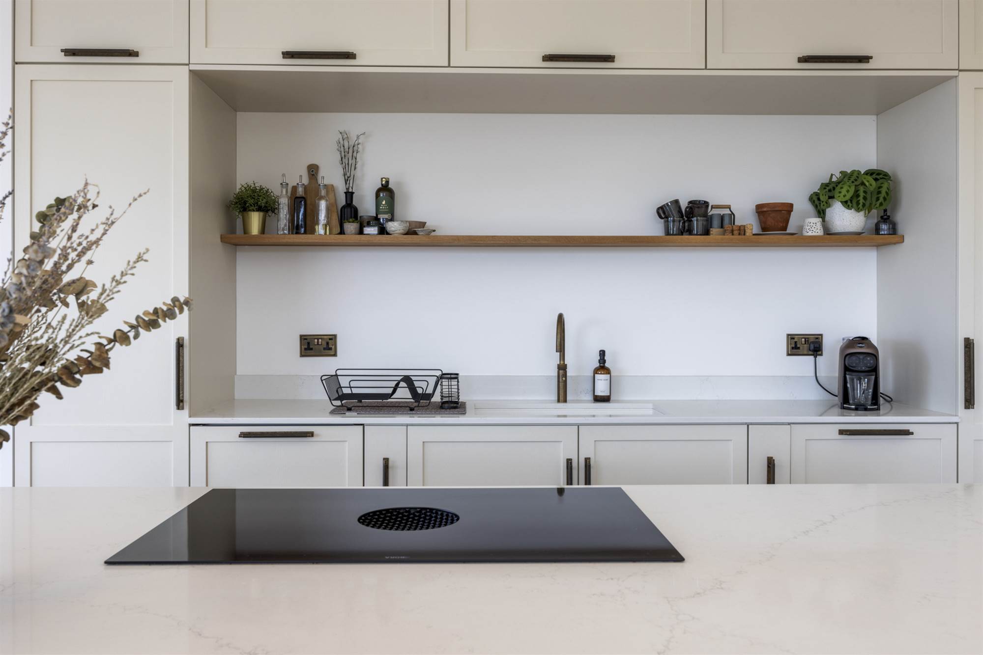 Shaker Style fitted Kitchen with floor to ceiling units incorporating a full size fridge and full size freezer and dishwasher. Caple deep sink unit with Quooker boiling & filter water tap. Michael Angelo Quartz work surface. Centre island with matching work surface, Bora downdraft induction hob and breakfast bar.