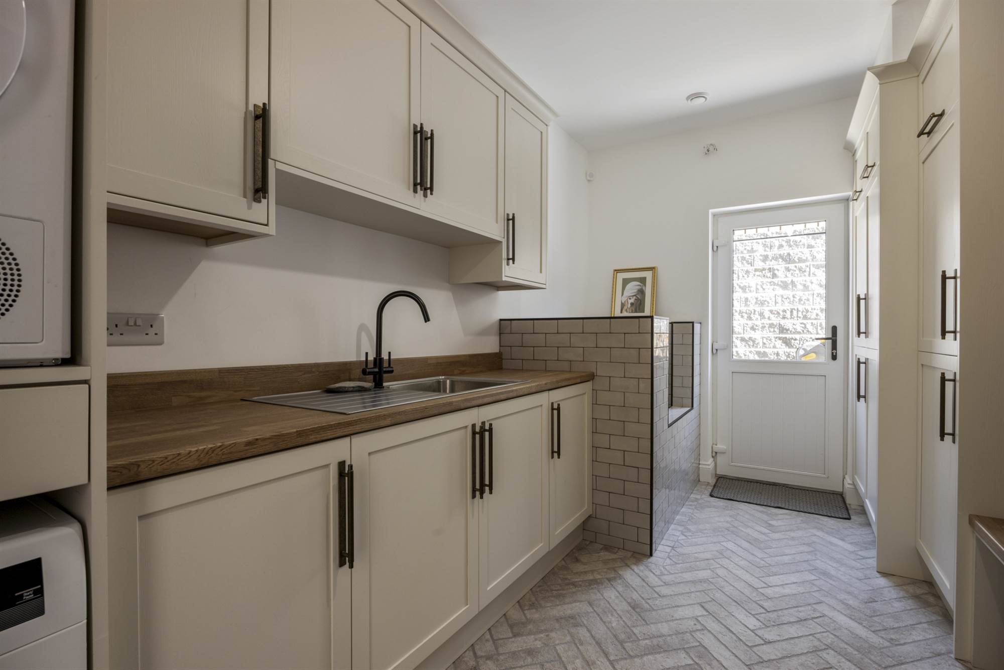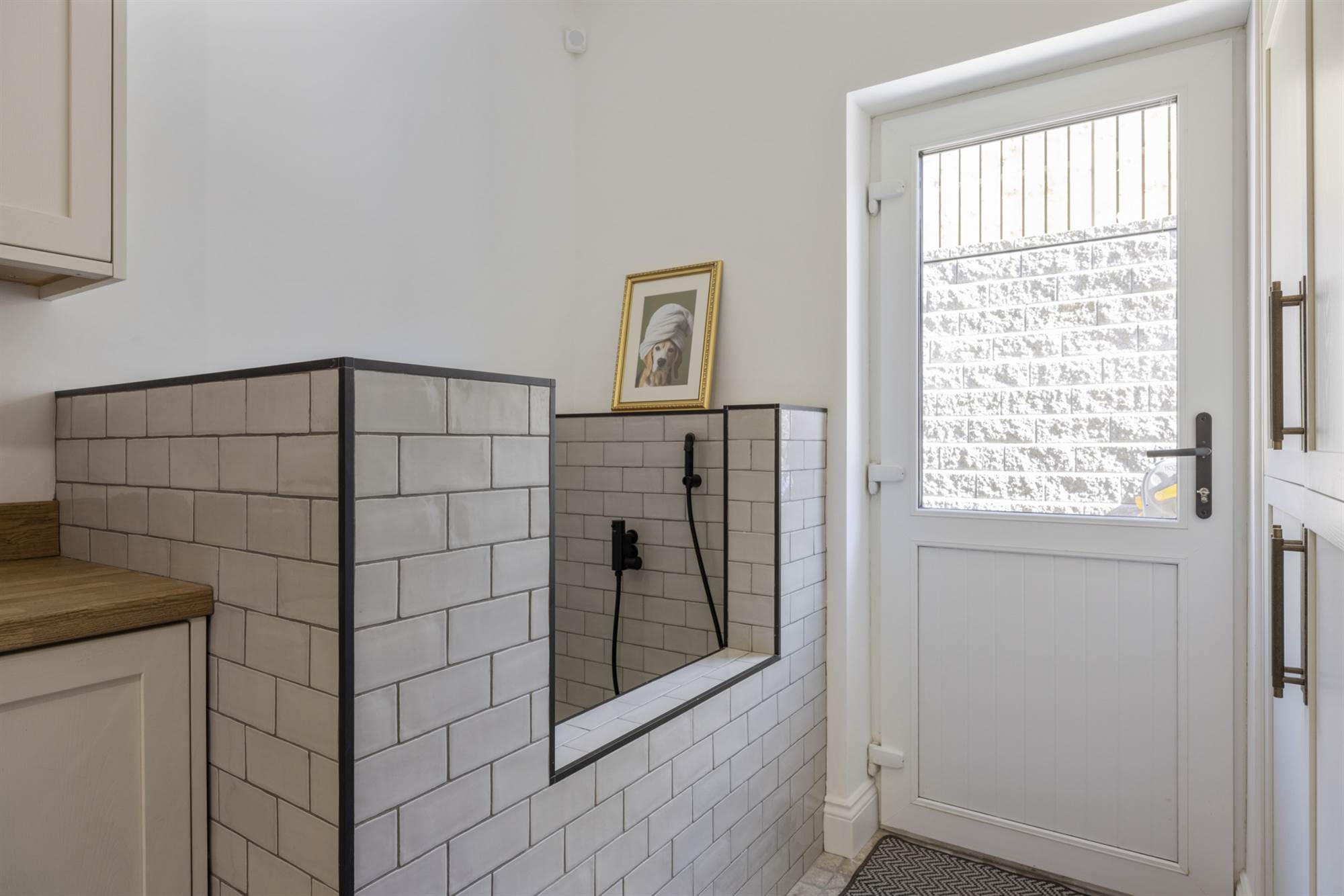 Range of high and low level shaker style built in units, single drainer stainless steel sink unit, plumbed for washing machine. Matching units with coat rack, seating area and storage below. Fully tiled dog bath with hand shower. Rear access.