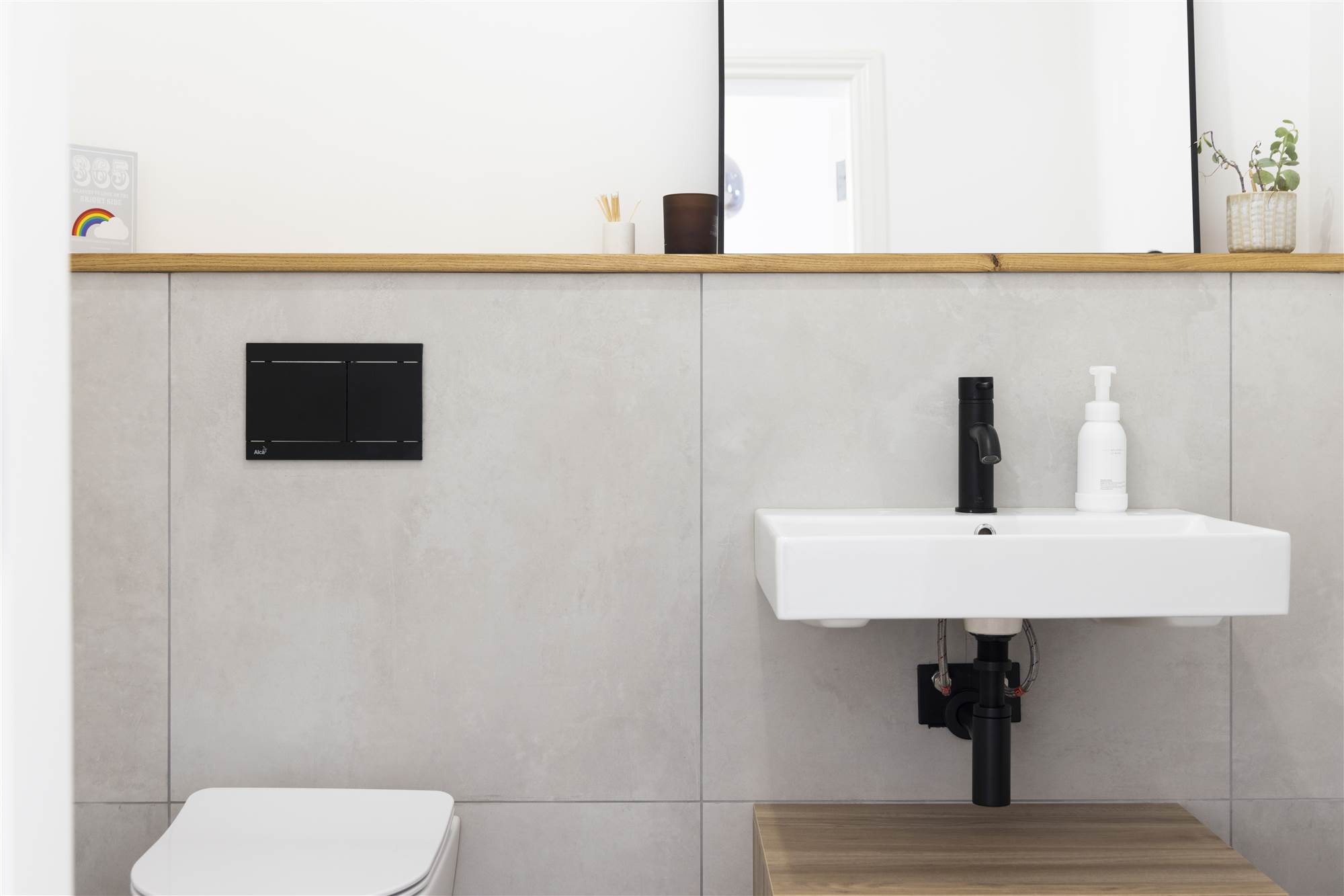 Low flush w/c and sink unit with storage below, part tiled walls, tiled floor, Matte black heated towel rail.