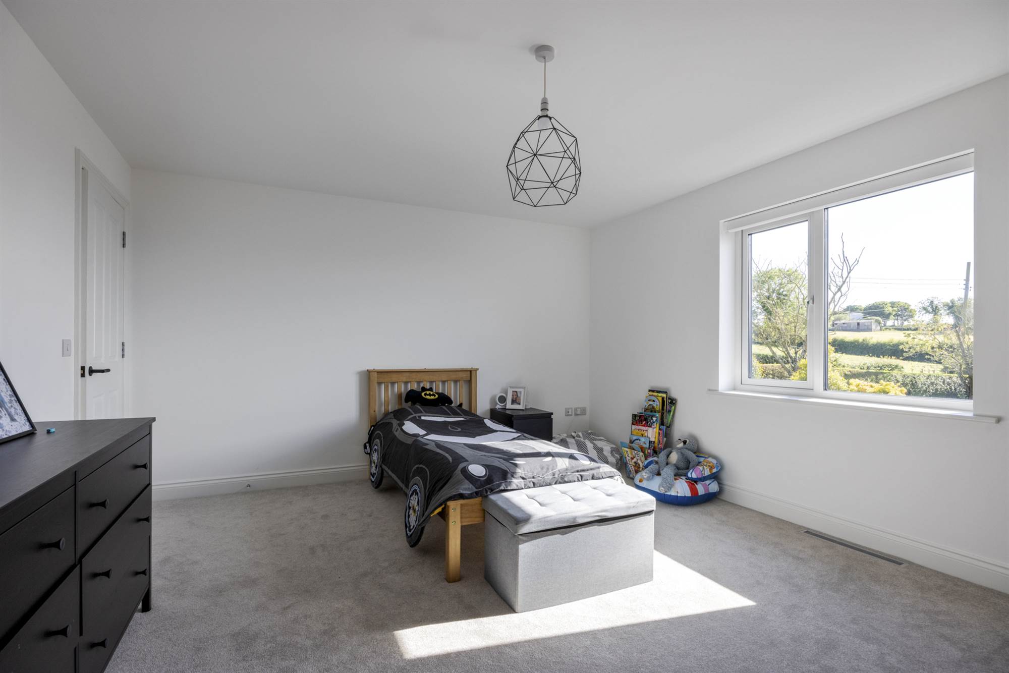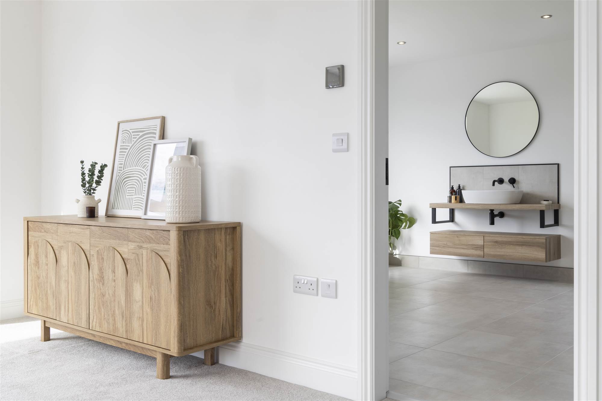 A stunning suite comprising free standing oval bath with floor mounted mixer taps and hand shower in matte black, positioned in from of the picture window, sink unit with mixer taps in matte black and storage below. Also within the en-suite there is a wet area with ceiling mounted water fall shower head and hand shower finished in matte black, electrically controlled blinds. Spotlights.
