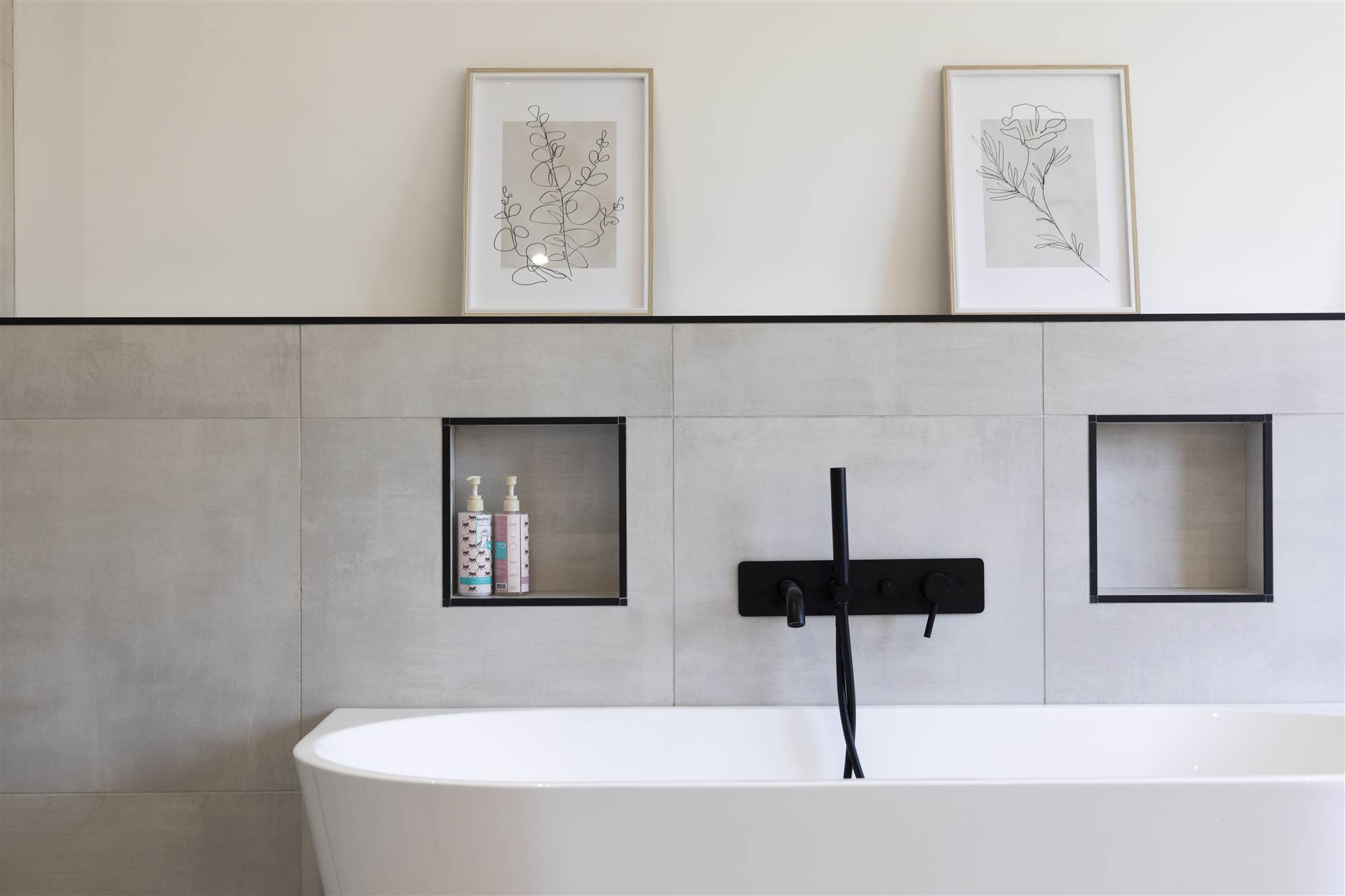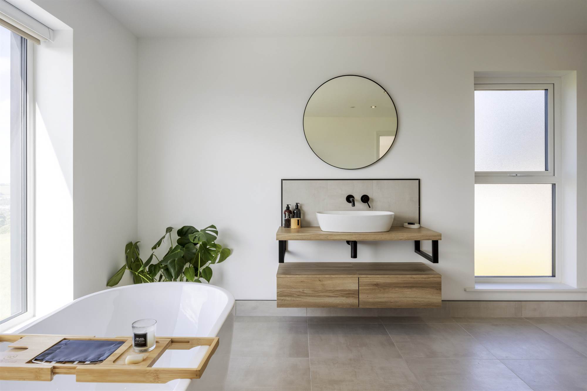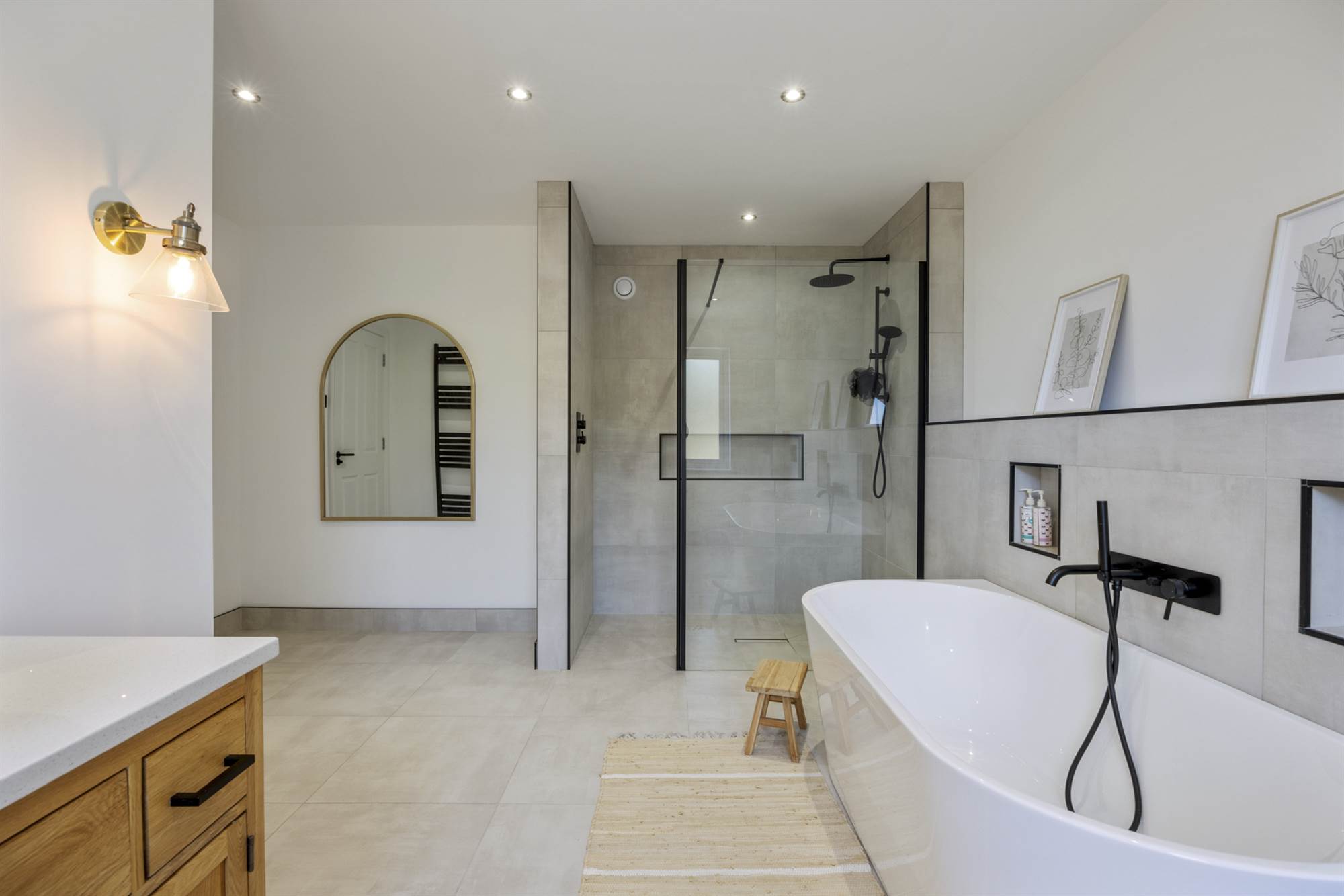 Comprising oval bath with matte black wall mounted mixer taps and hand shower, wash hand basin with mixer taps and storage below, hidden cistern w/c, wet area with matte black waterfall style shower attachment and hand shower with recessed shelving, spotlights, matte black heated towel rail. Thermostatically controlled "Cosytoes" under floor heating.