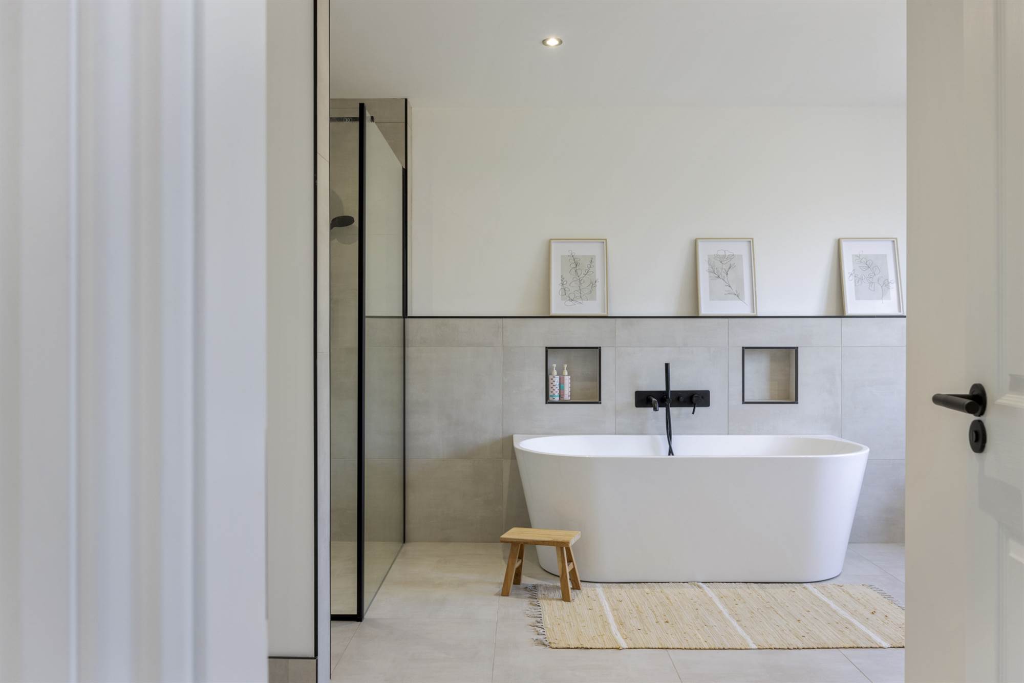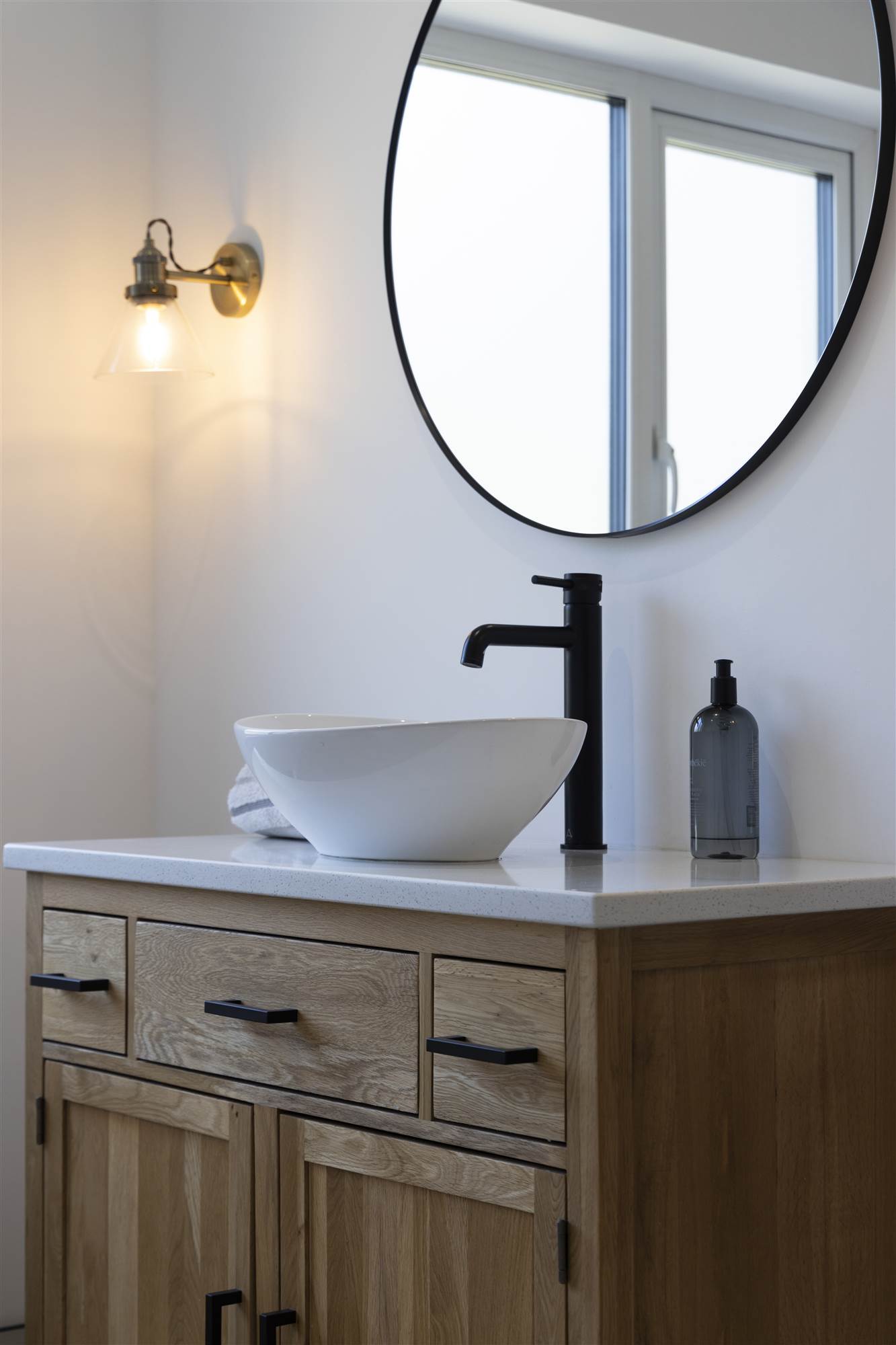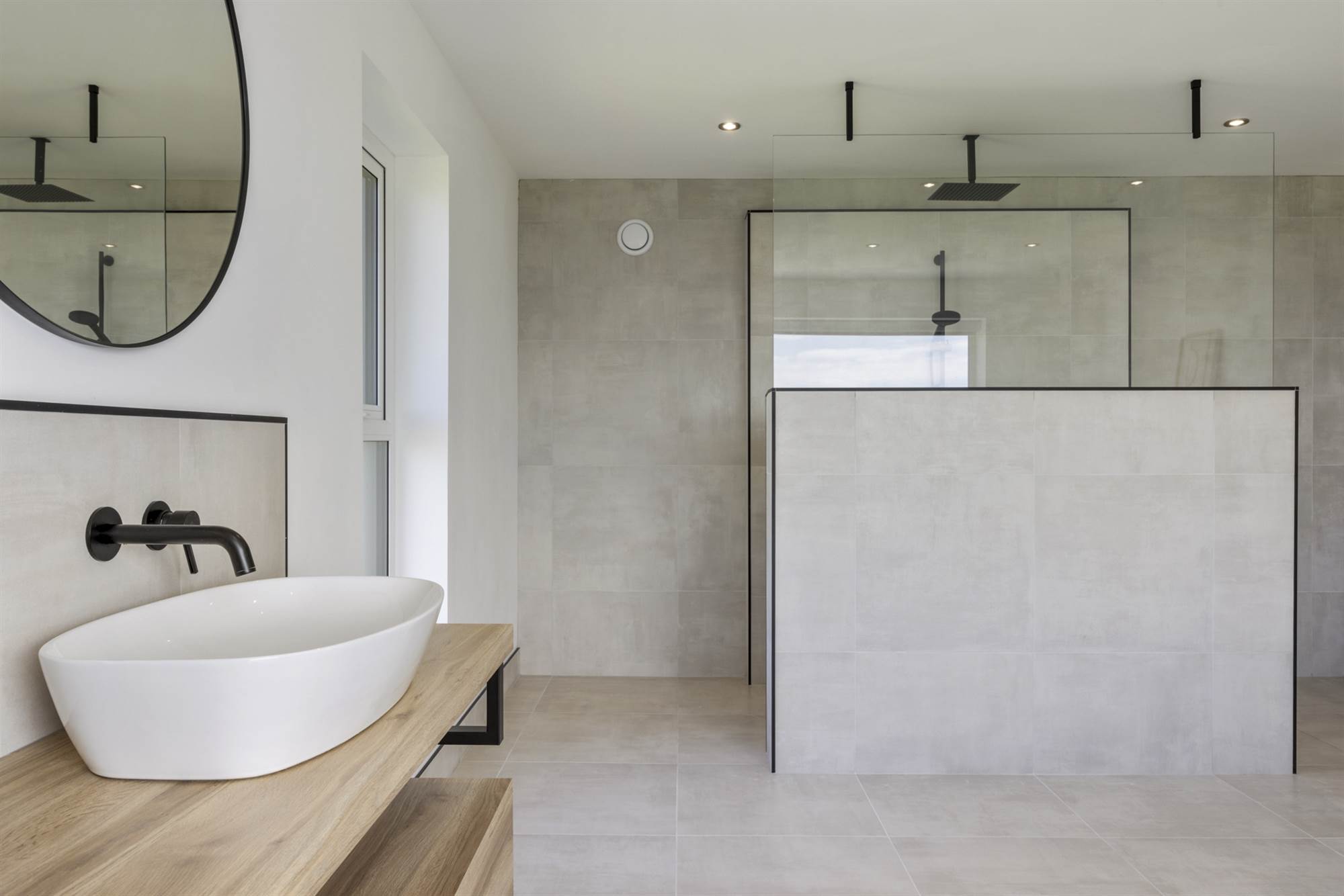 Comprising oval bath with matte black wall mounted mixer taps and hand shower, wash hand basin with mixer taps and storage below, hidden cistern w/c, wet area with matte black waterfall style shower attachment and hand shower with recessed shelving, spotlights, matte black heated towel rail. Thermostatically controlled "Cosytoes" under floor heating.