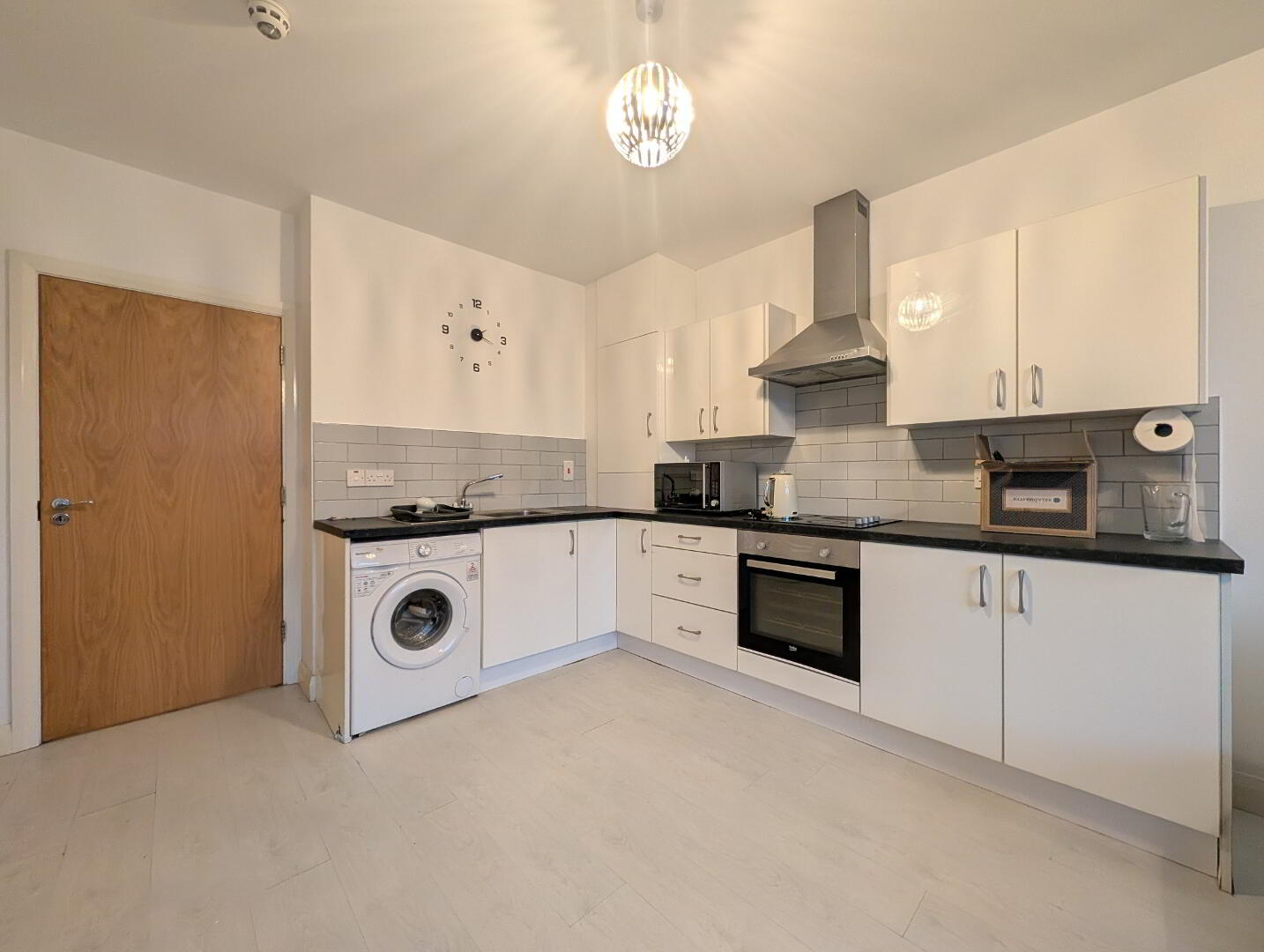 Wooden effect floor, range of contemporary high & low level kitchen units, tiled splash-back, laminated work surfaces, integrated oven / hob / extractor, integrated fridge/freezer, free standing washing machine