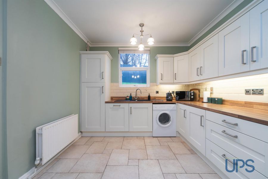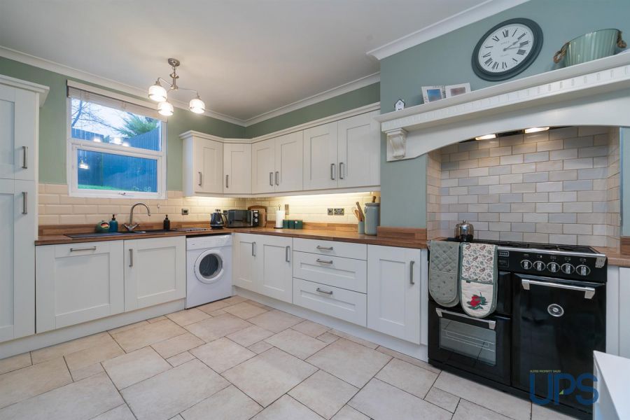 Bowl and a half composite sink unit, extensive range of high and low level units, formica worktops, range style cooker space, canopy extractor fan, integrated dishwasher, integrated fridge / freezer, tall larder, integrated washing machine, vented for tumble dryer, concealed gas boiler, partly tiled walls, ceramic tiled floor.