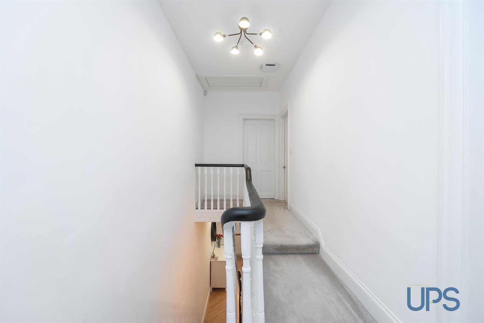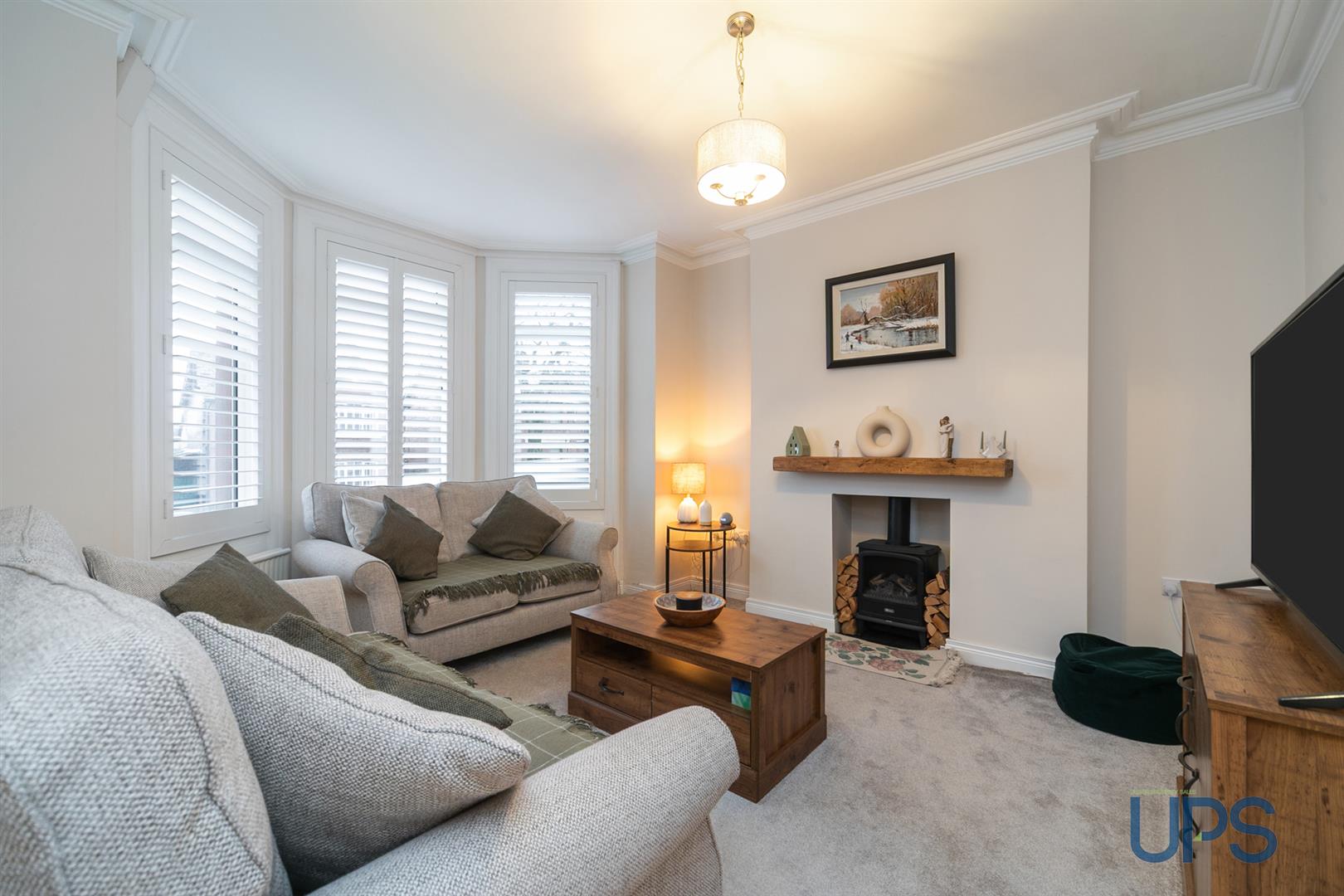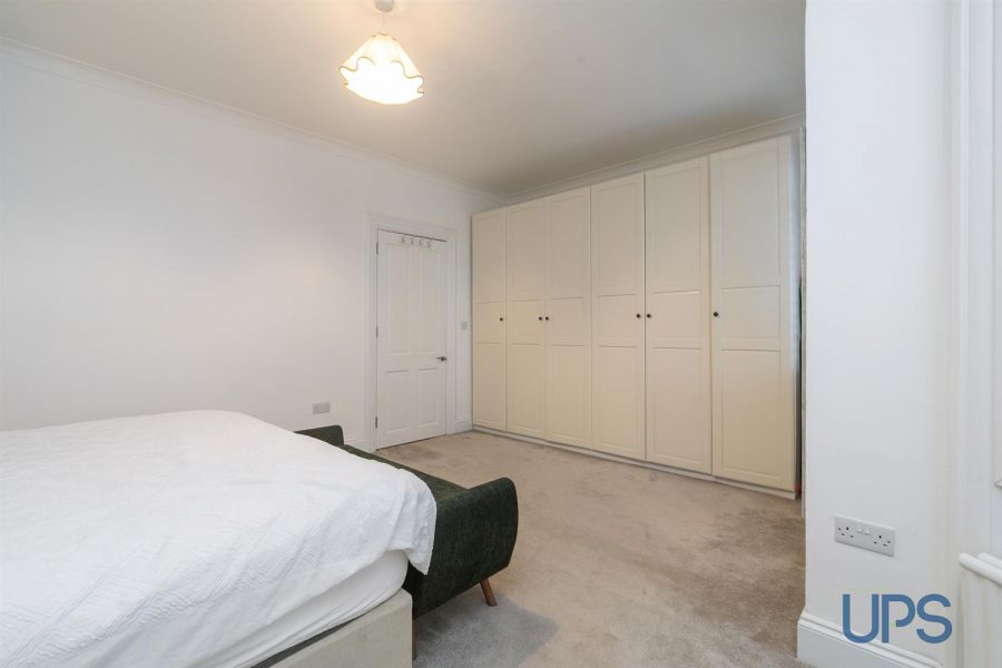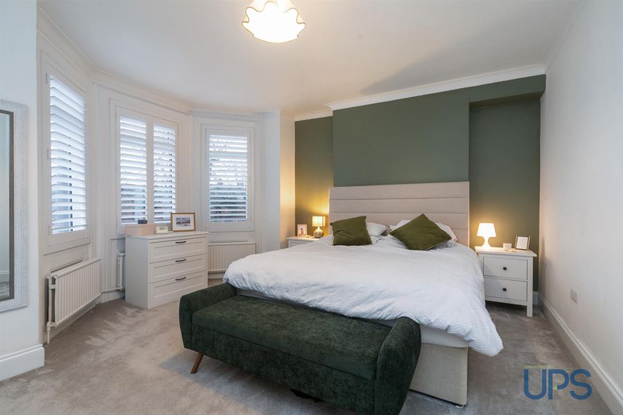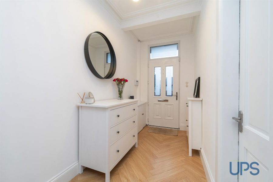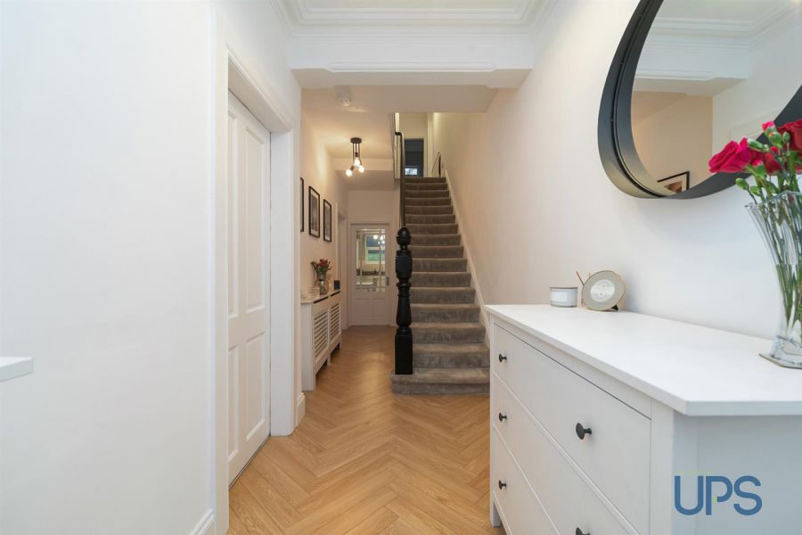 Cornice ceiling, herringbone wood laminate floor, panelled radiator.