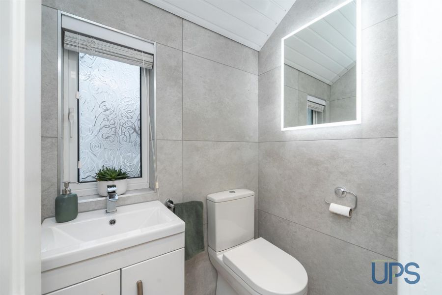 Deluxe white suite comprising low flush wc, vanity unit, fully tiled walls, ceramic tiled floor, pvc ceiling, recessed lighting.