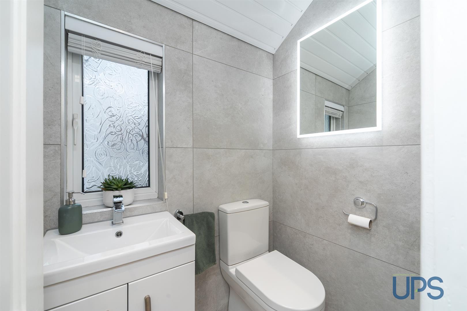 Deluxe white bathroom suite comprising walk-in shower, thermostatically controlled shower unit, drench head, telephone hand shower, vanity unit, fully tiled walls, ceramic tiled floor, feature chrome radiator, pvc ceiling, recessed lighting.