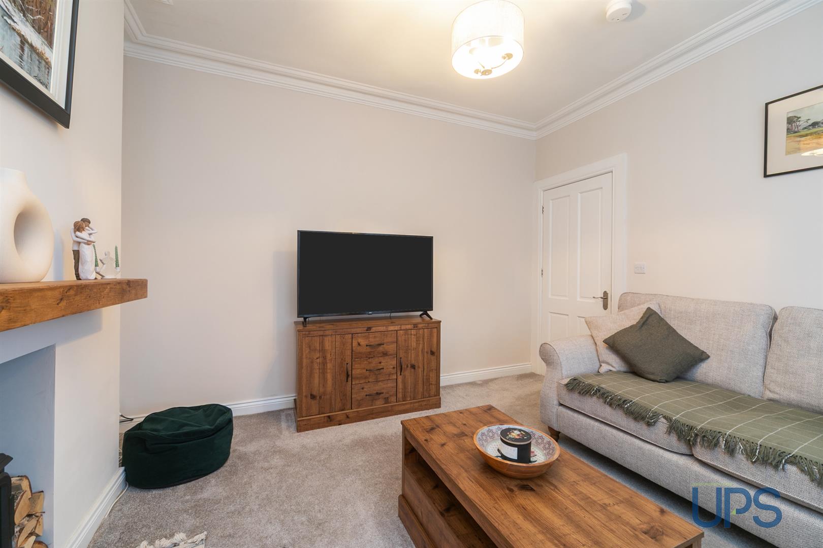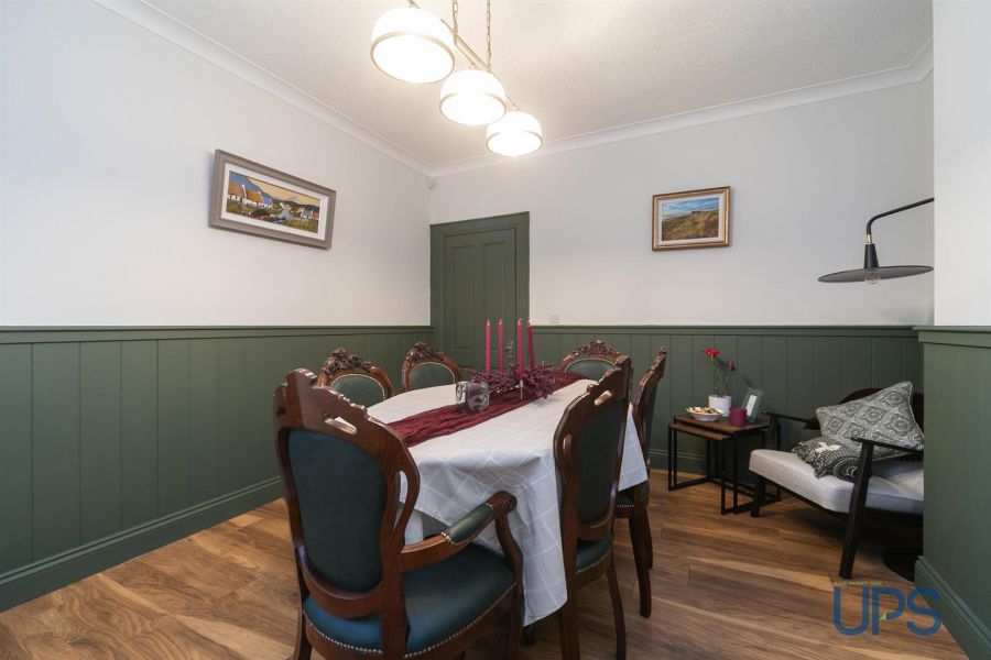 Wood laminate floor, part quarter panelled walls, 3 double panelled radiators.