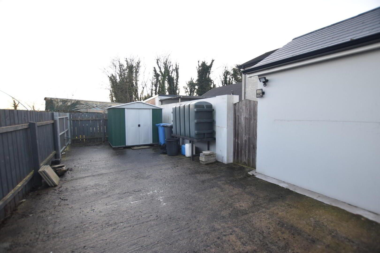 Concrete rear enclosed yard with shed.