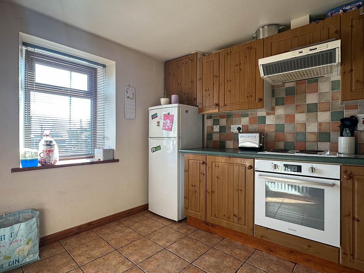 with eye and low level units, tiled between units, tiled floor, single drainer stainless steel sink unit, Indesit hob, Whirlpool hob, Electrolux extractor fan, space for fridge / freezer, plumbed for washing machine.