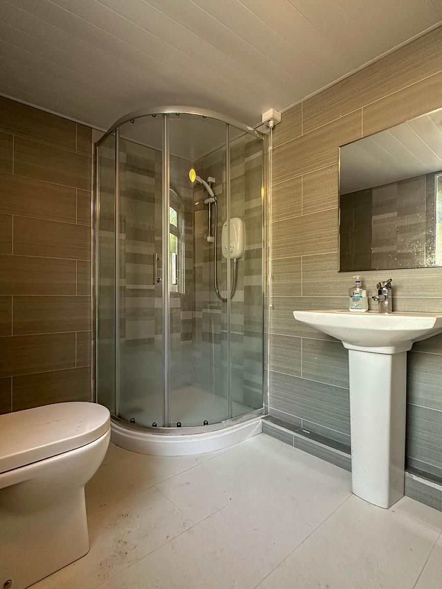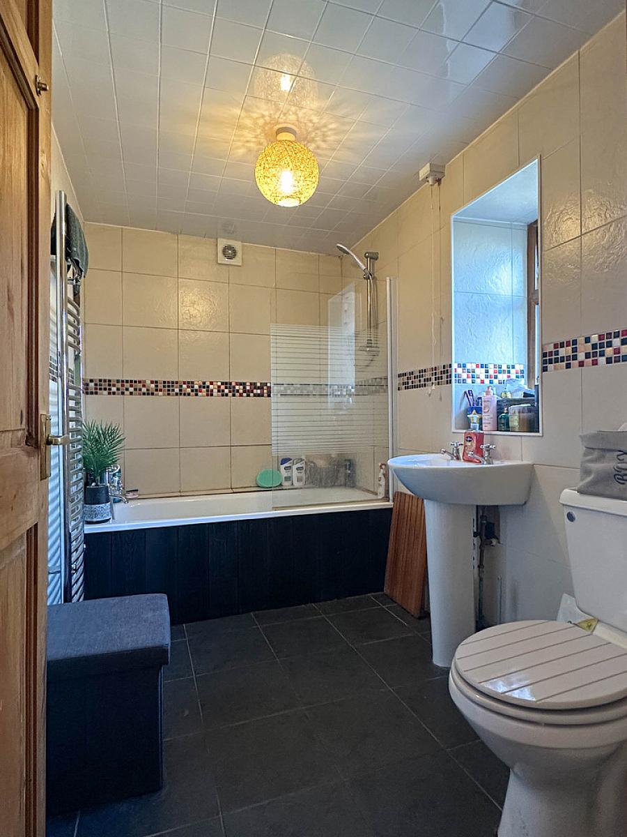 Comprising panel bath with telephone hand shower, Redring electric shower fitting and shower screen over bath, wash hand basin, w.c., fully tiled walls and ceiling, extractor fan, tiled floor, heated towel rail.