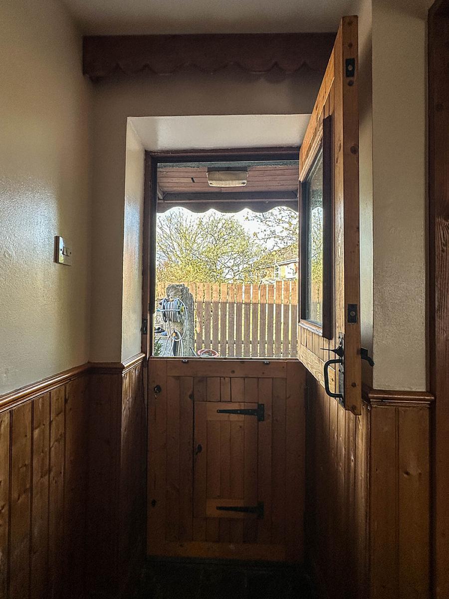 With woodgrain uPVC glass panel front door, tiled floor, half panelled walls.