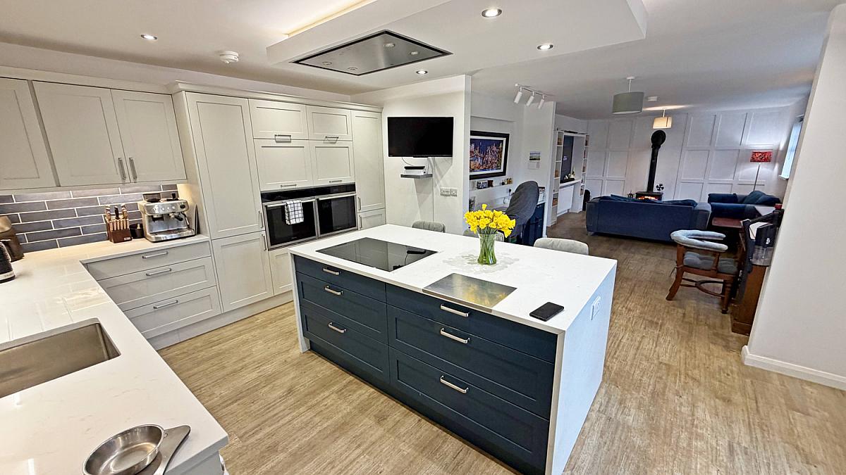 Kitchen - High and low level storage units with quartz top, integrated dishwasher and fridge freezer, centre island with quartz top, integrated hob, bulk head with recessed lighting and extractor fan, space for American fridge freezer and patio doors leading to the rear garden.