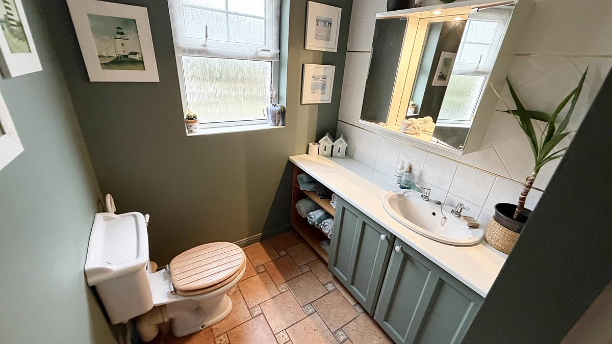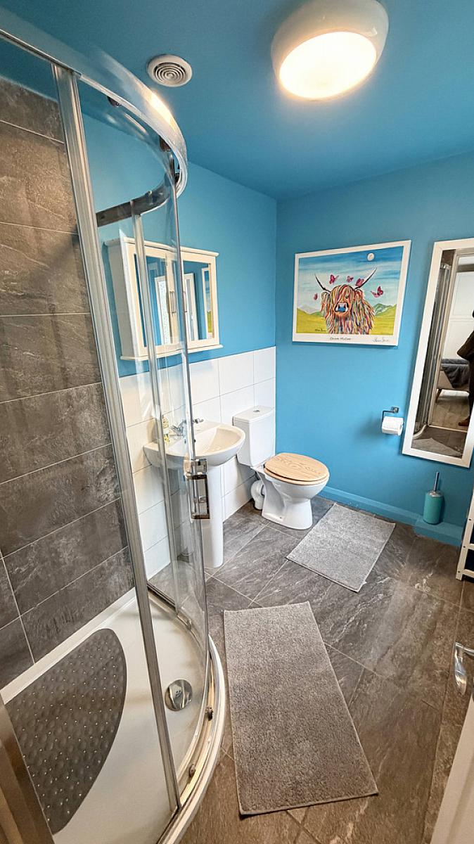 Tiled floors, heated towel rail, shower cubicle with electric shower, low flush WC, vanity unit wash hand basin.