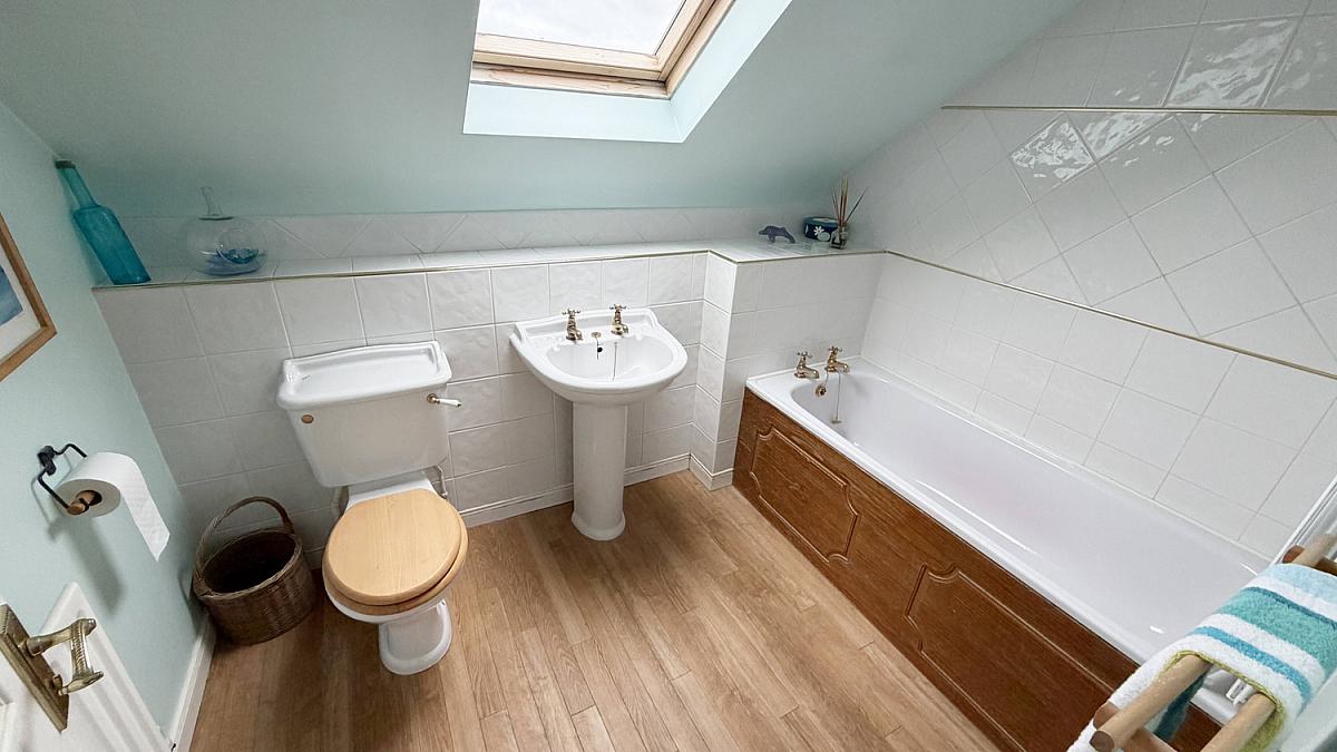 Low flush WC, panelled bath electric shower, pedestal wash hand basin, panel bath with electric shower over, amtico flooring.