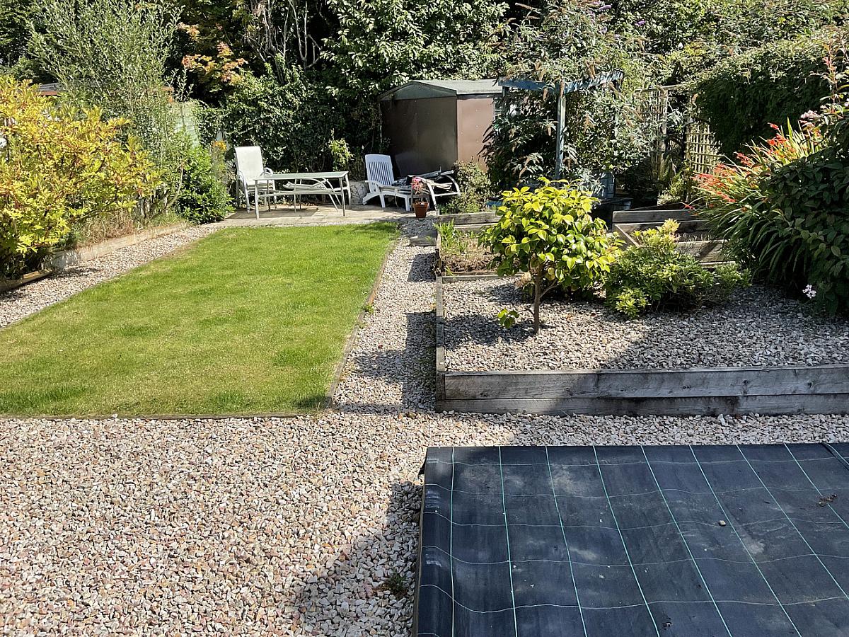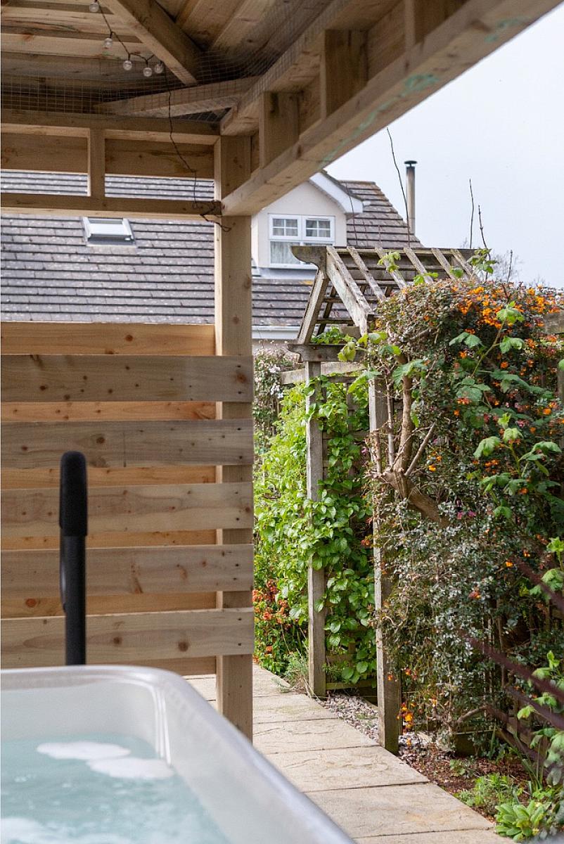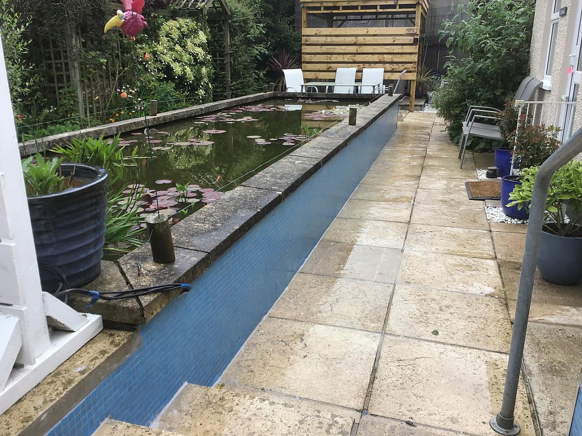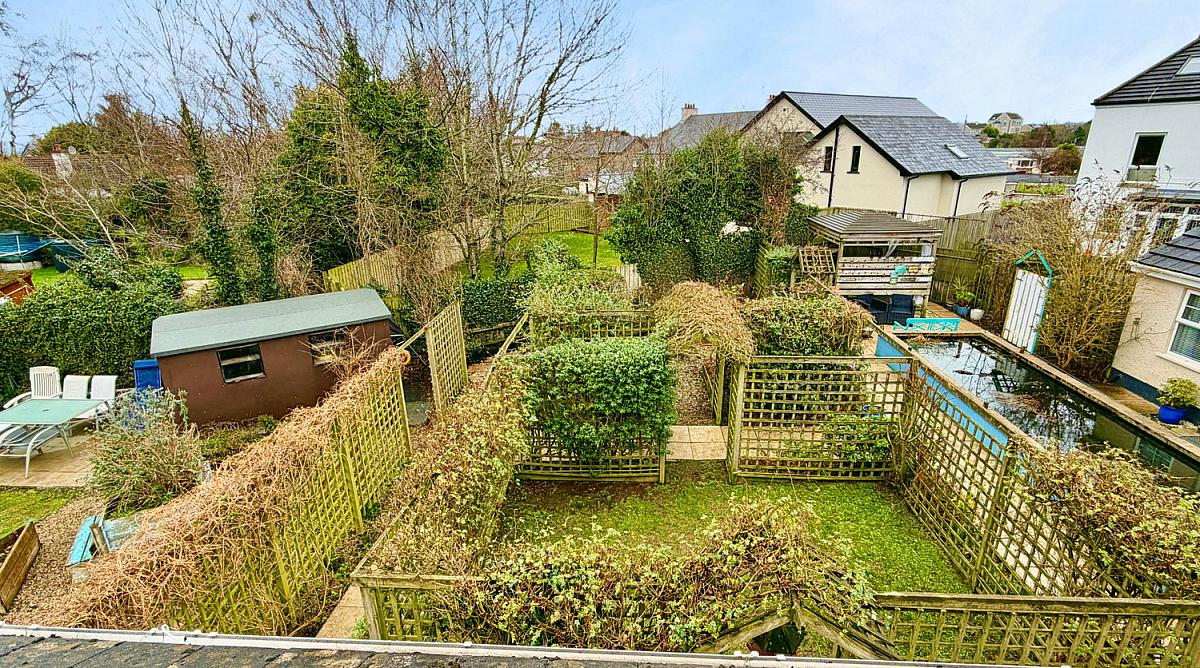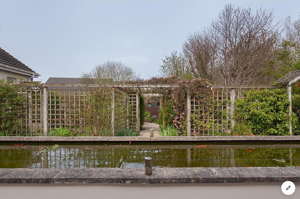 Planters, mature trees, hedging, raised koi pond and hot tub area to rear garden!