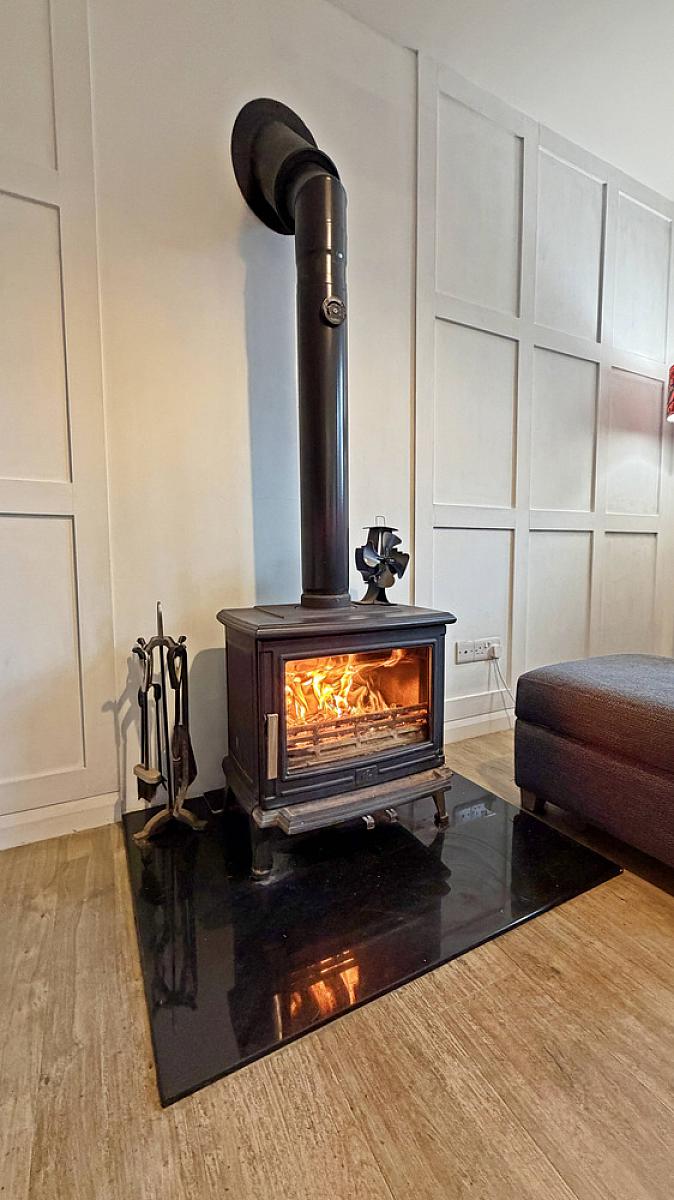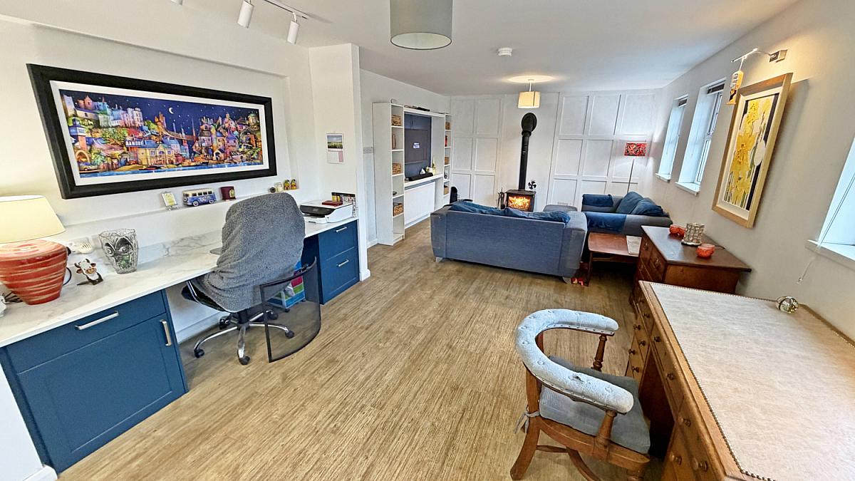 Living / dining - fitted work space, wood burning stove, LVT flooring and wall paneling