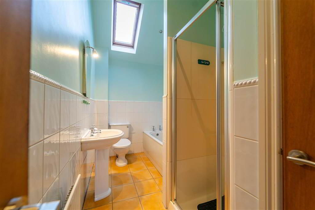 Four-piece Suite comprising a Shower Cubicle with a Mira Electric Shower, a Panel Bath, a W.C. and a Pedestal Wash Hand Basin. Complete with Tiled Flooring, part Tiled Walls, recessed Spotlights, an Extractor Fan and access to the Hot-press.
