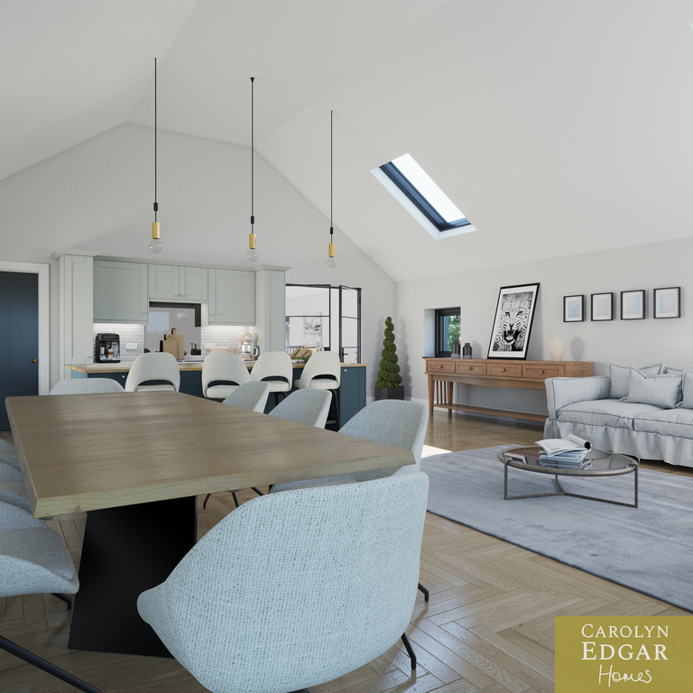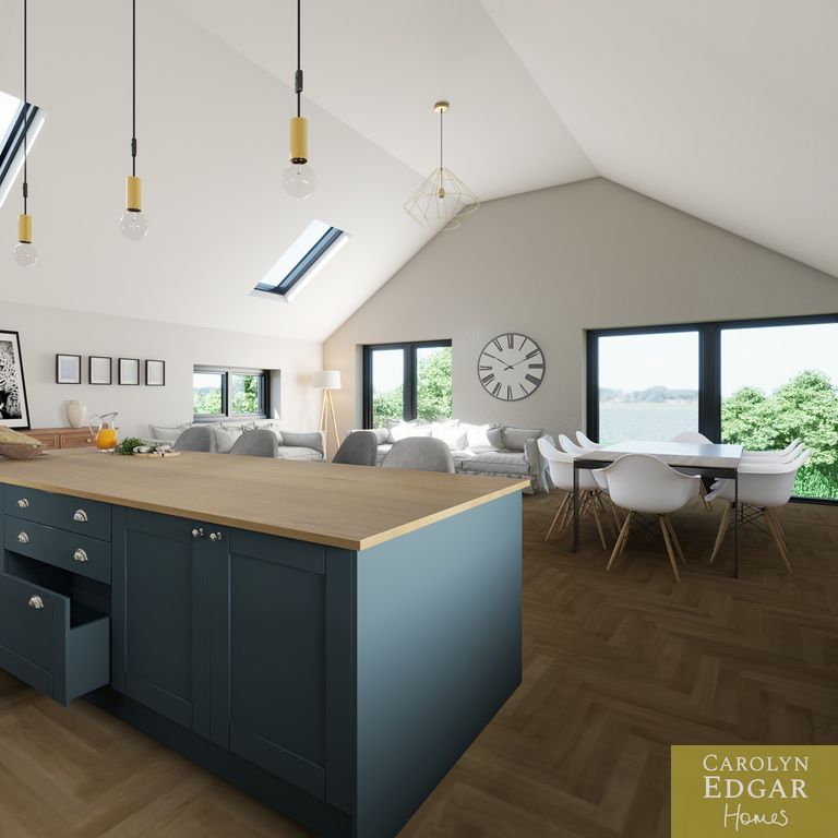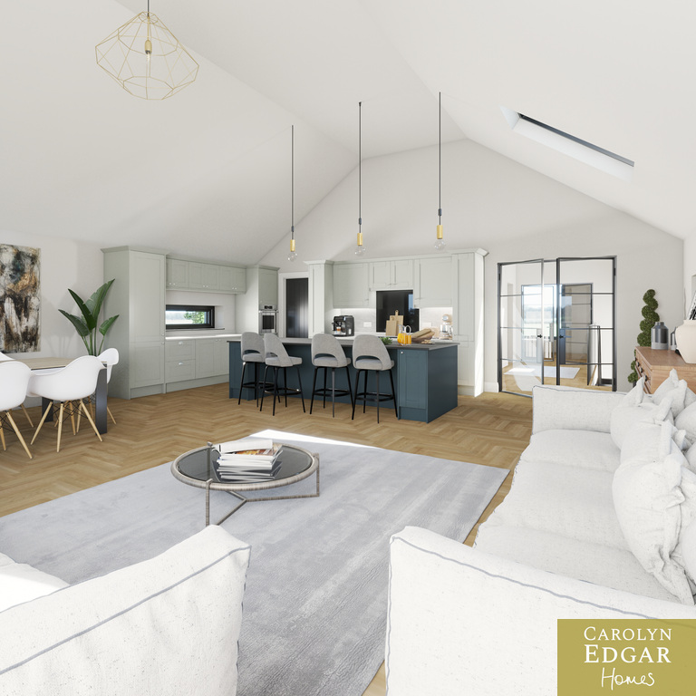 The upper level showcases an impressive open-plan living space designed for modern family life and easy entertaining. Featuring a vaulted ceiling flooding the room with natural light this magnificent area floods with natural light, the contemporary luxury fitted kitchen includes many extra features including large centre island and built-in pantry and flows seamlessly into the stylish living and dining area with Juliette balcony perfectly positioned to take full advantage of the elevated countryside views. Also on the first floor is spacious cinema/TV room, a separate study or home office, and an additional bathroom, providing excellent flexibility for modern living and working from home.