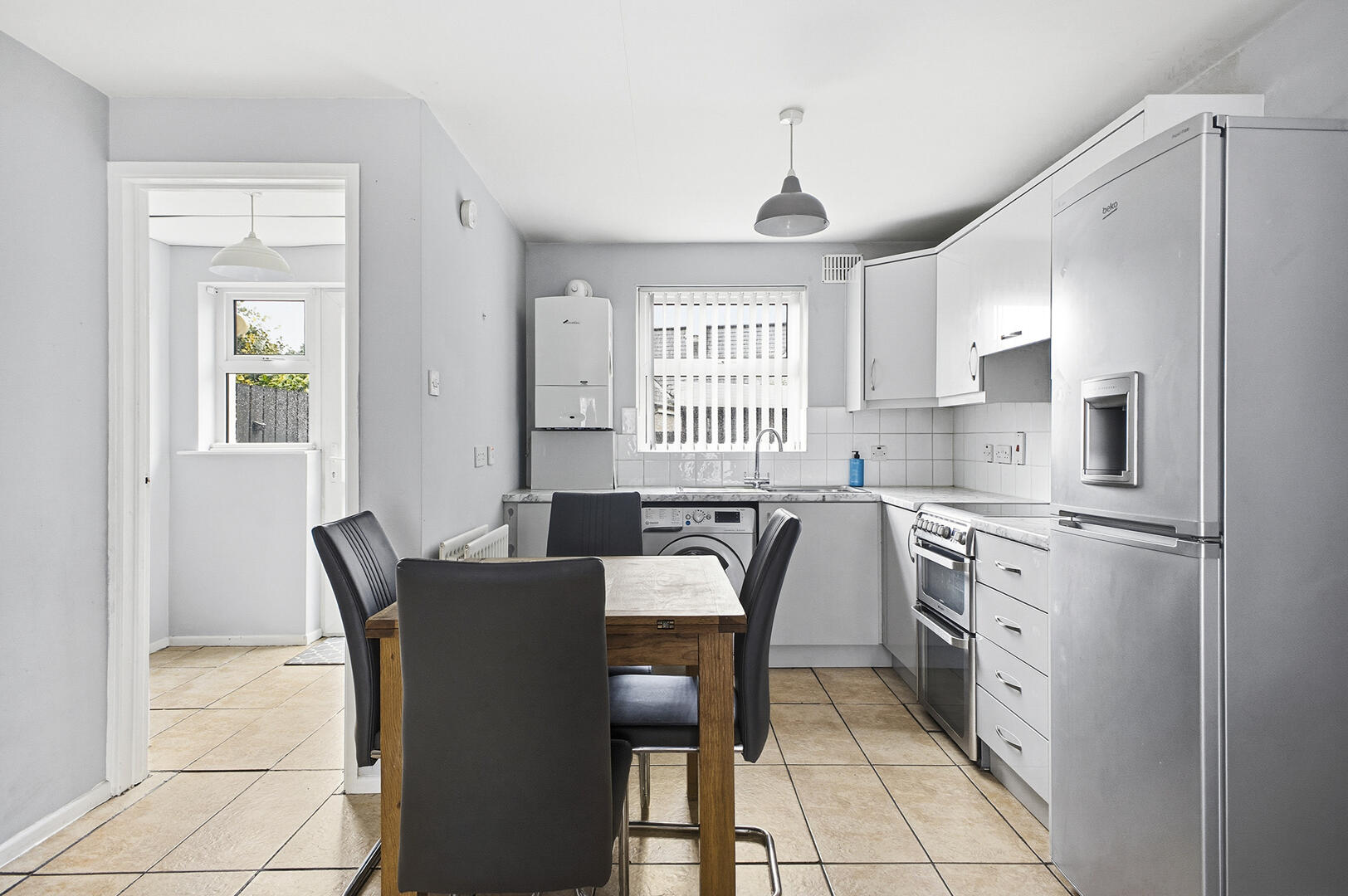 Laminate wood flooring, outlook to front, open to kitchen where there is porcelain tiled floor, range of low- and high-level units with laminate worktop, tiled splashback, space for fridge / freezer, space for cooker/ extractor fan, single sink and drainer with chrome mixer tap, space for washing machine, Worcester boiler.