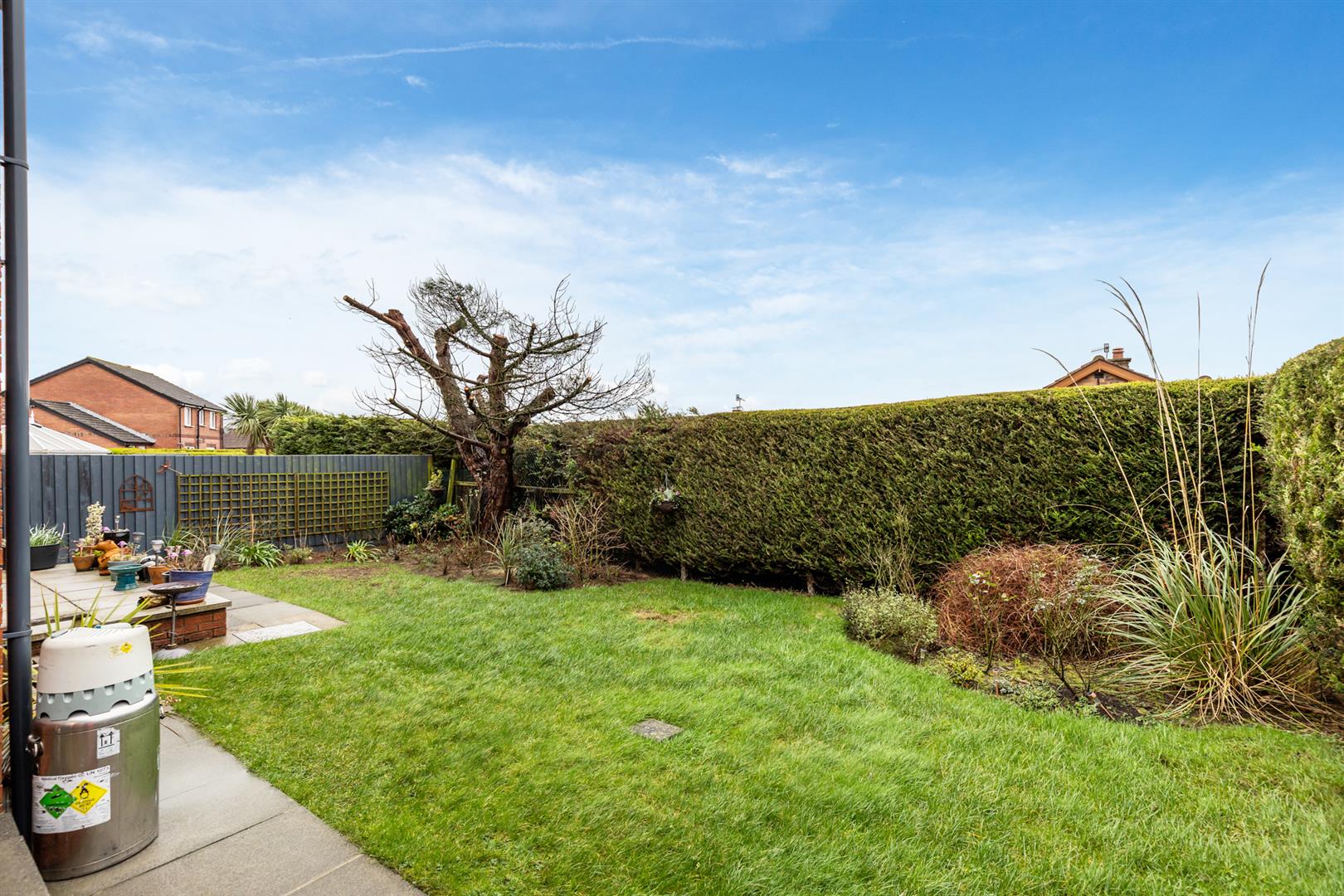Outside, the front of the property has a tarmac driveway providing parking for multiple vehicles, along with rockery and mature planting. The fully enclosed rear garden offers a good level of privacy and includes a patio area, lawn and established trees, making it ideal for outdoor use.