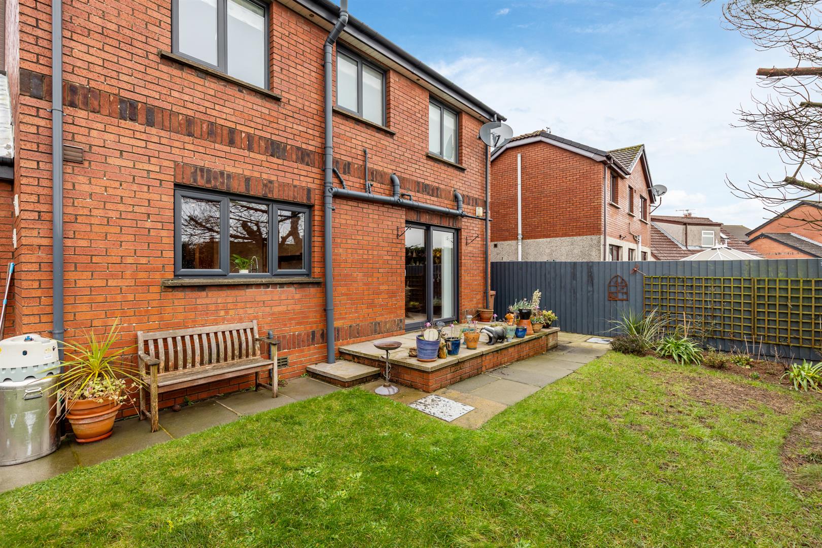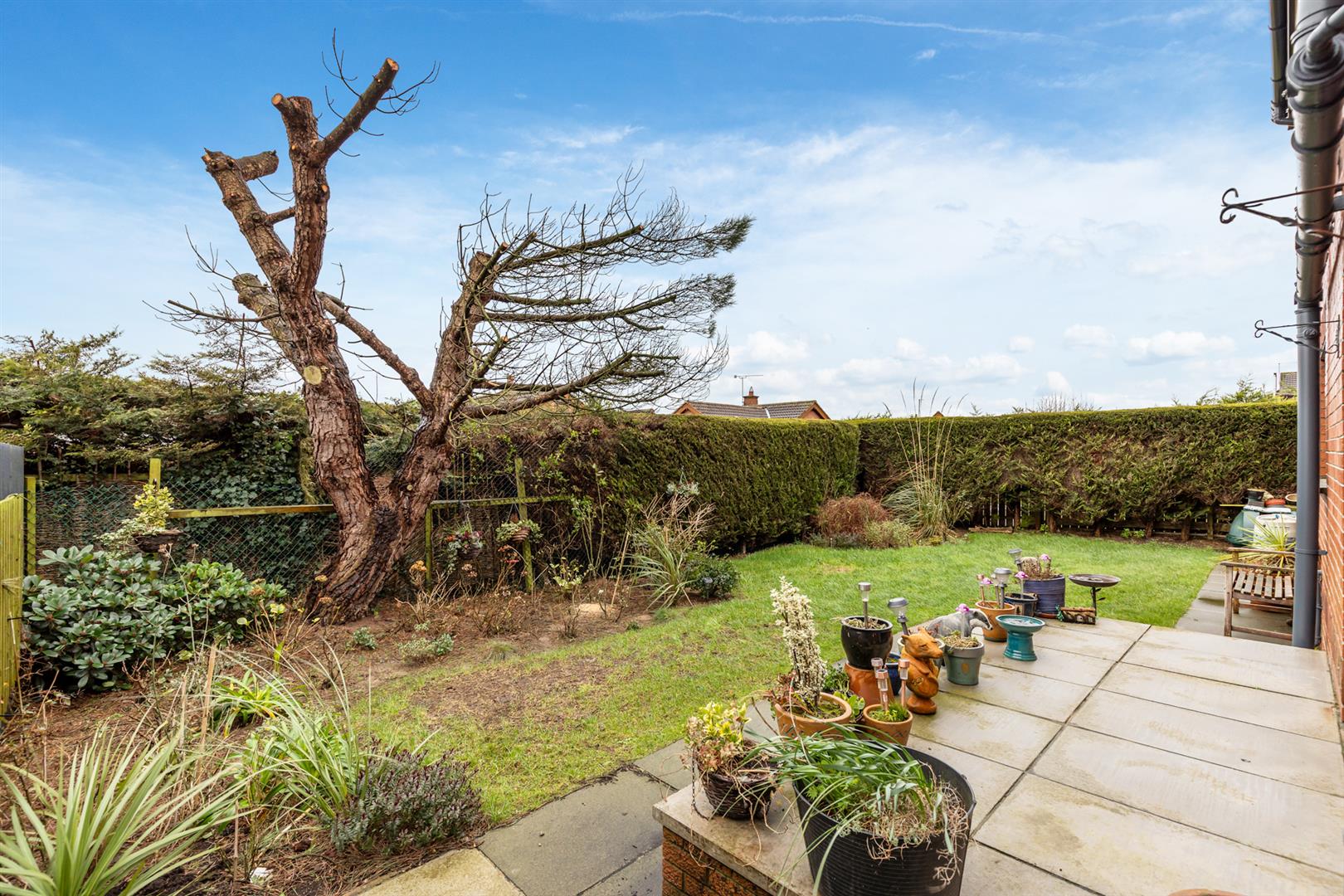 Rear: Patio area, paved walkway, area in lawn, enclosed, mature plants and trees.