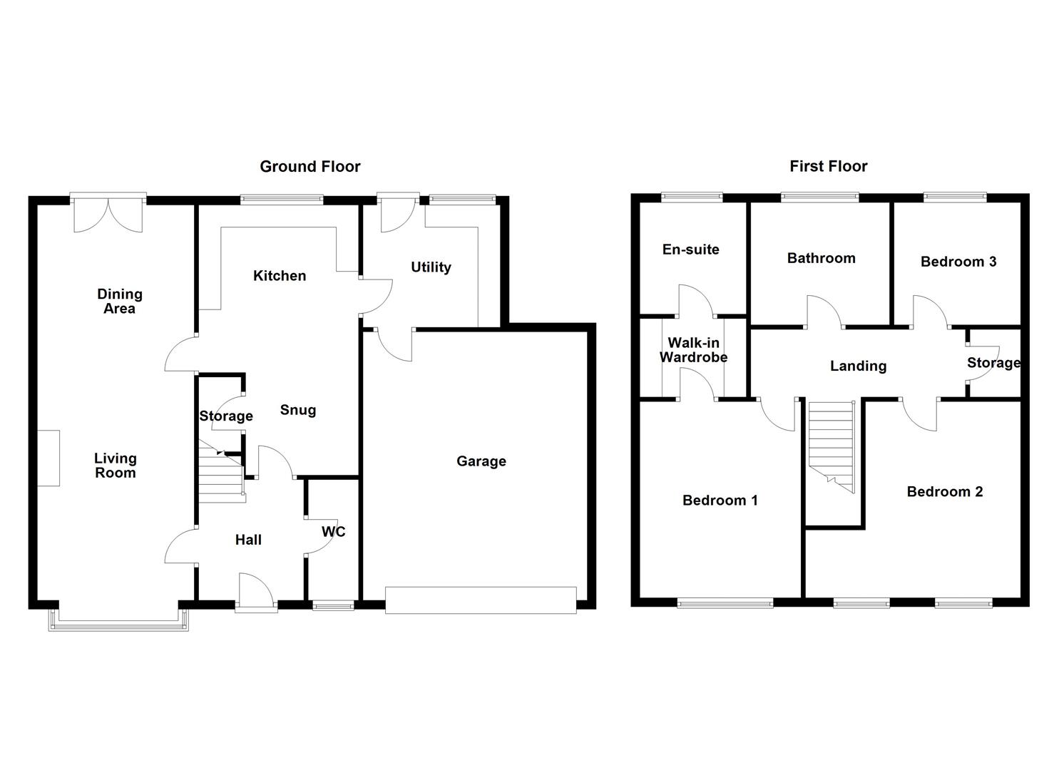 The ground floor features a large open-plan living and dining room with bay window, fireplace with electric fire and sliding doors leading to the rear garden. The kitchen is fitted with a range of units and has space for casual dining, while the adjoining snug provides a useful second living area or home office. A separate utility room offers additional storage and access to the rear garden and integral garage, and a ground floor WC completes the layout.