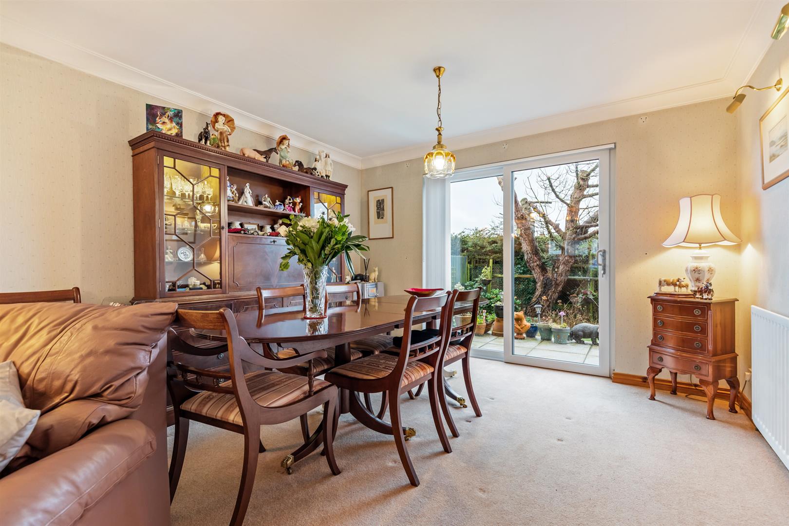 Bay window, fireplace with electric fire, wooden mantle, tiled surround and hearth, sliding glass doors to rear garden.