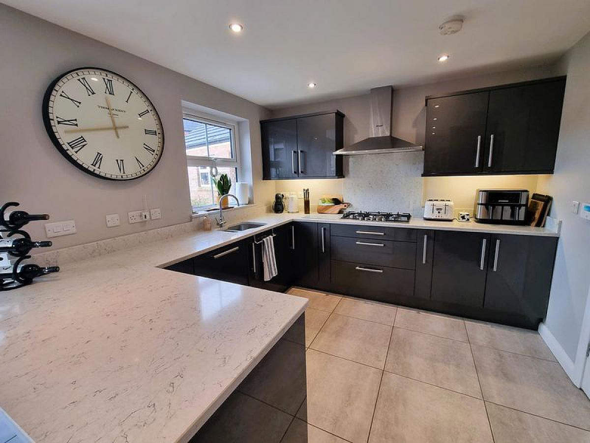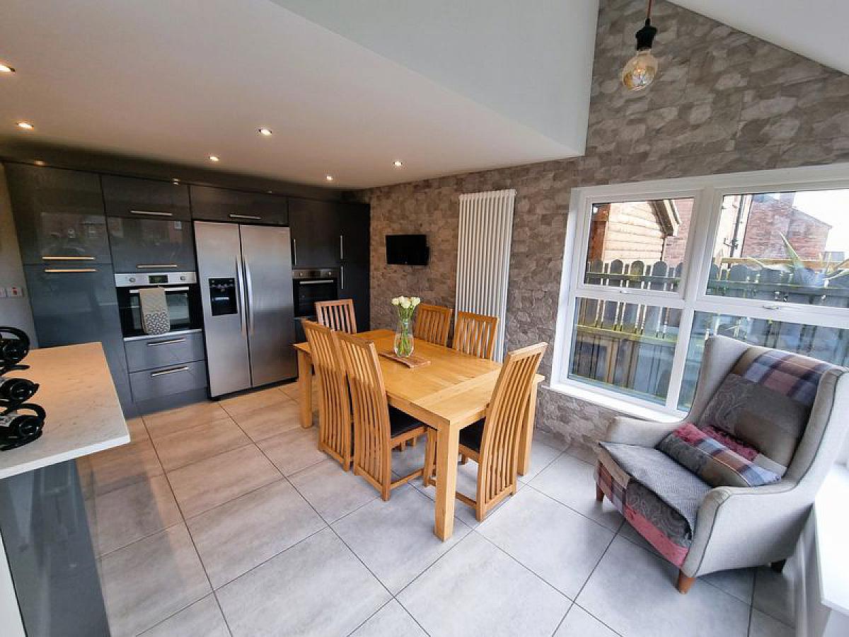 Extensive range of high and low level units with granite worksurfaces and matching splashback, 1 1/2 bowl stainless steel sink unit and mixer tap. 5 ring gas hob and stainless steel splashback, 2 built-in eyelevel ovens, plumbed for american style fridge/freezer, integrated dishwasher, plumbed for automatic washing machine, pull out larder, pot drawer. Feature stone effect wall, ceramic tiled floor, recessed lighting, double radiator and vertical radiator, uPVC rear door.