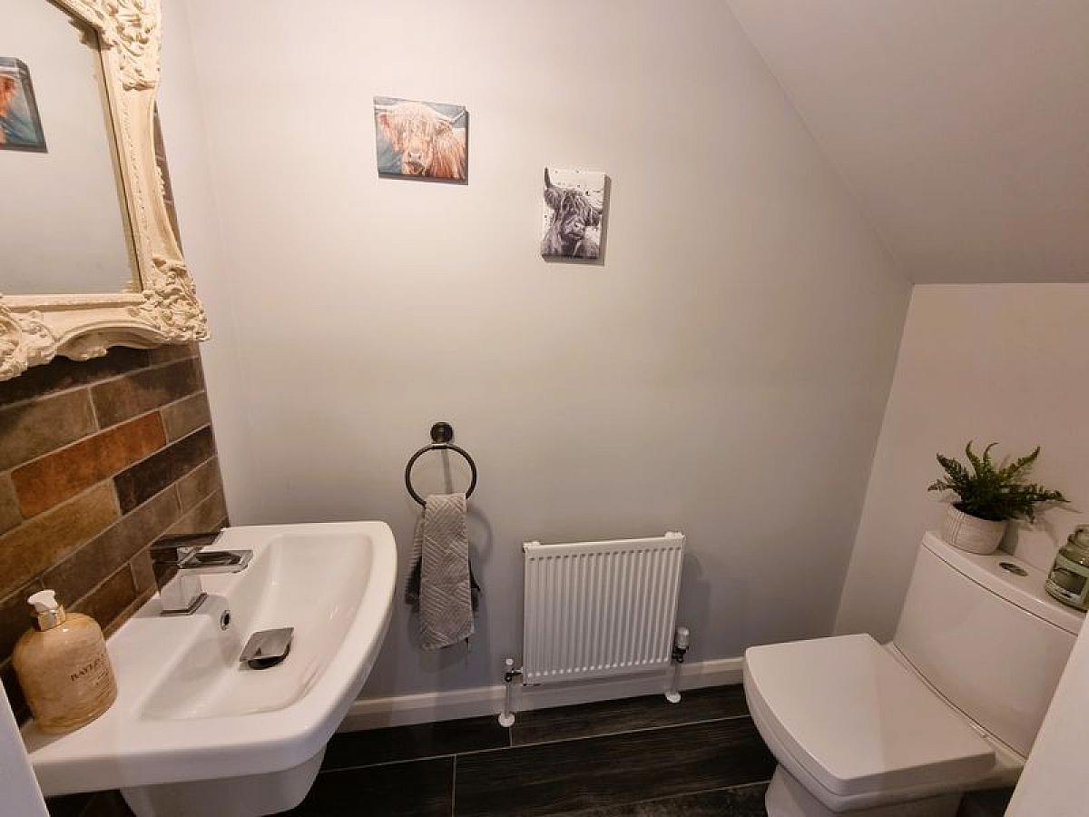 White suite comprising low flush WC, semi-pedestal wash hand basin, ceramic tiled floor, part tiled walls, radiator.