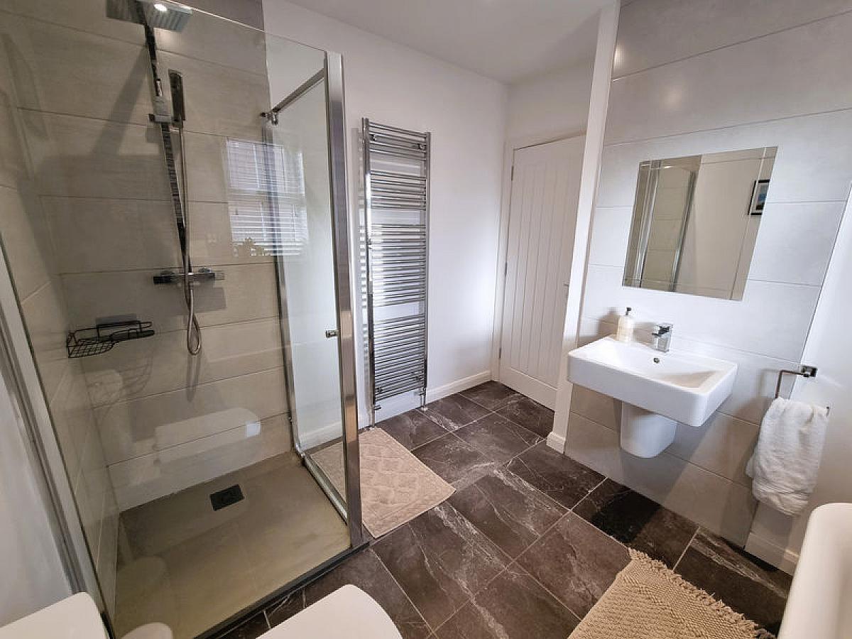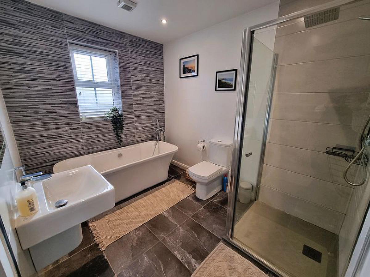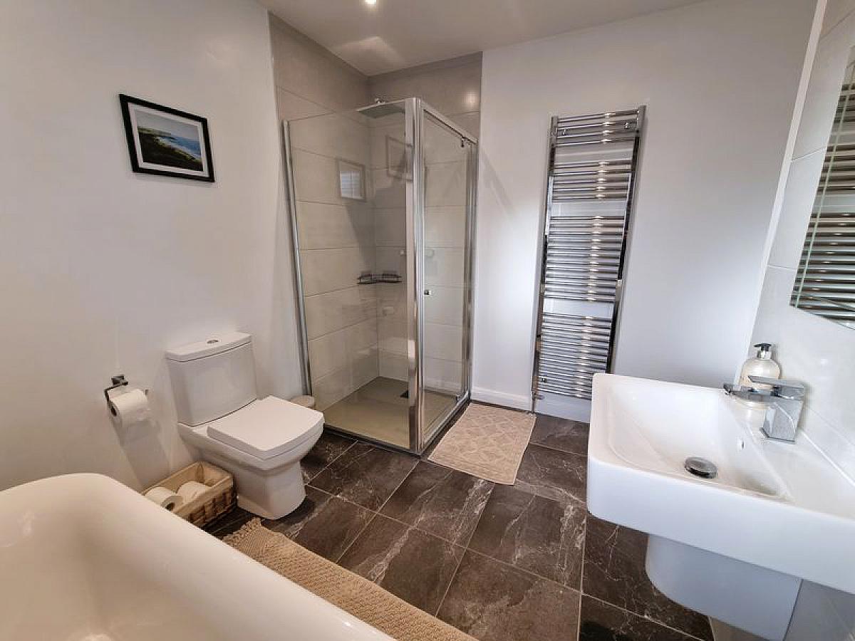 Modern white suite comprising low flush WC, semi-pedestal wash hand basin, free standing bath with mixer tap and shower attachment and shower cubicle with mixer shower and rain shower head. Part tiled walls, chrome towel rail.