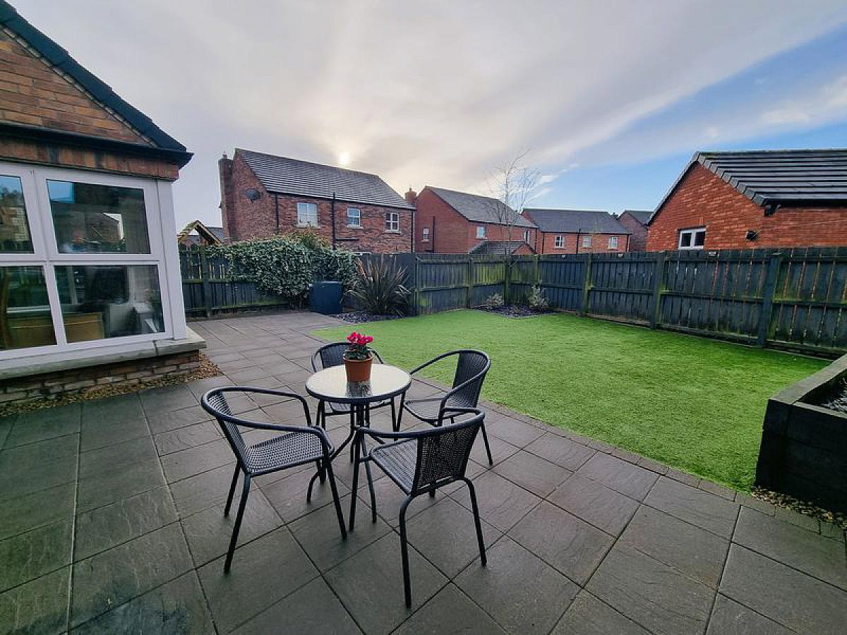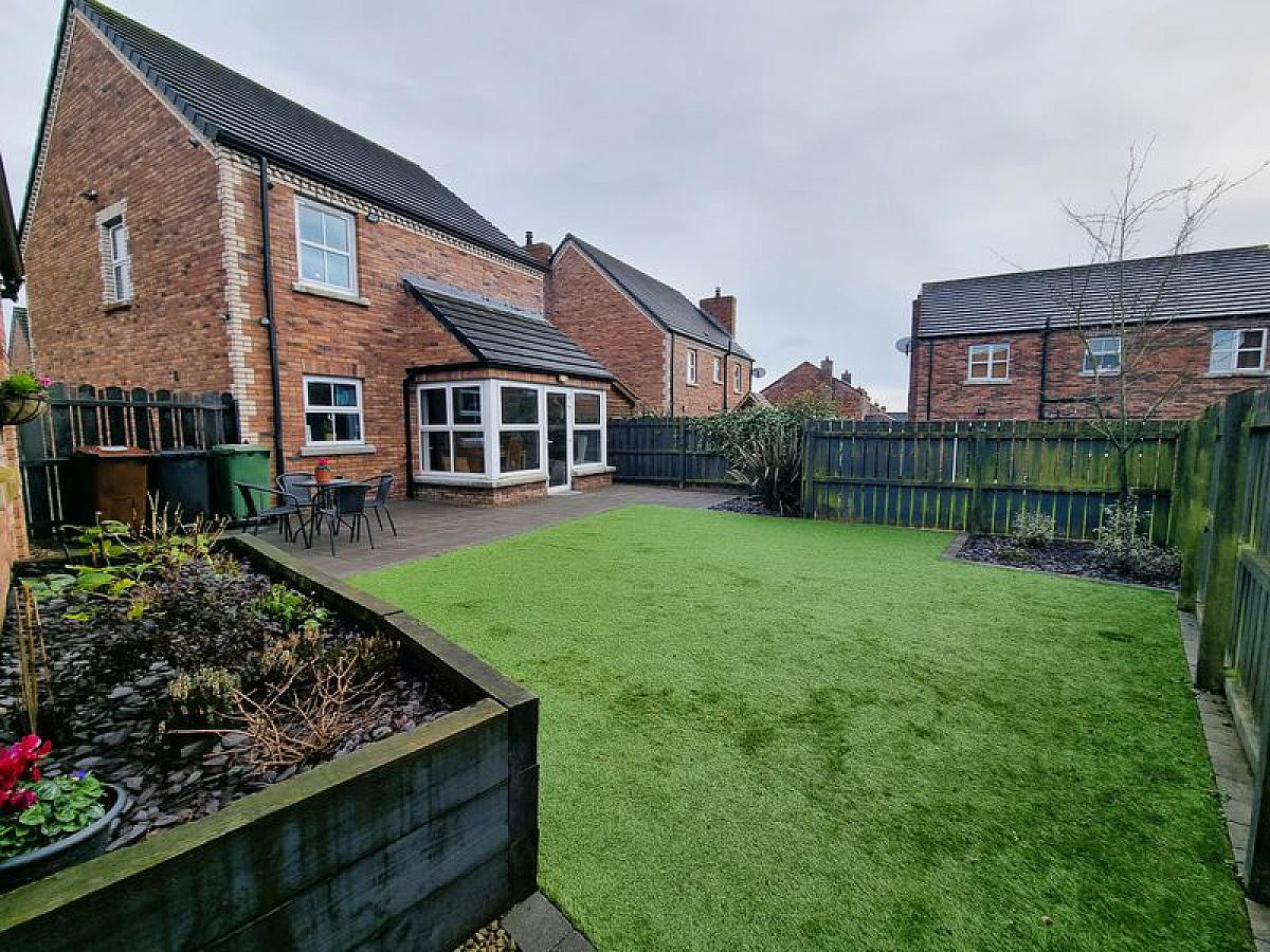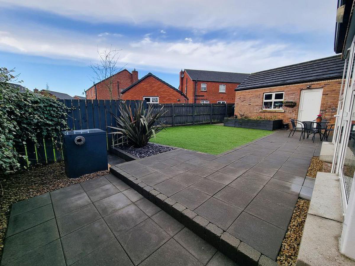 Tidy front garden with decorative stone and shrubs, brick paviour driveway with ample carparking, fully enclosed rear gardens laid in brick paviour patio area, artificial grass, raised planters, outside light and tap. Plastic oil storage tank, oil fired boiler in housing.