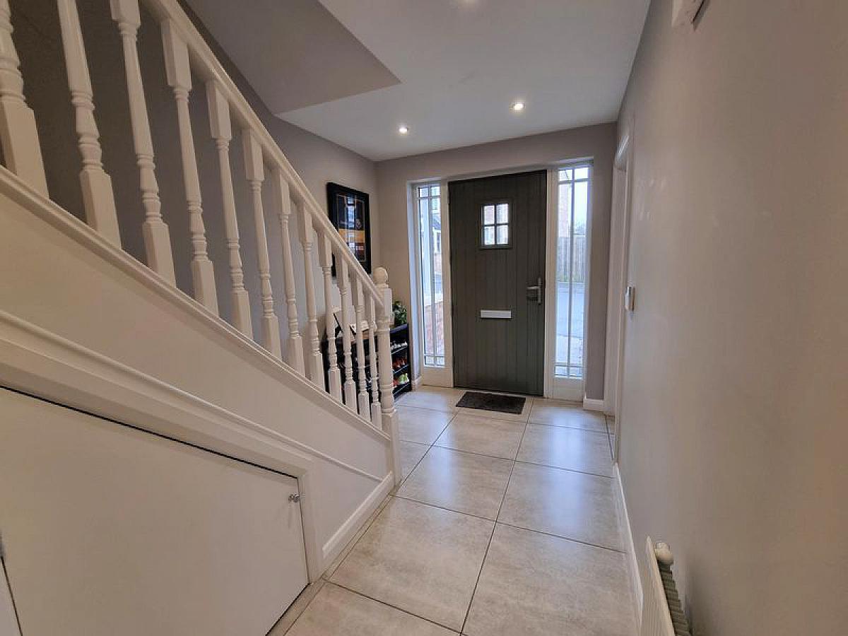 Composite front door with glazed side panel, ceramic tiled floor, understairs storage.