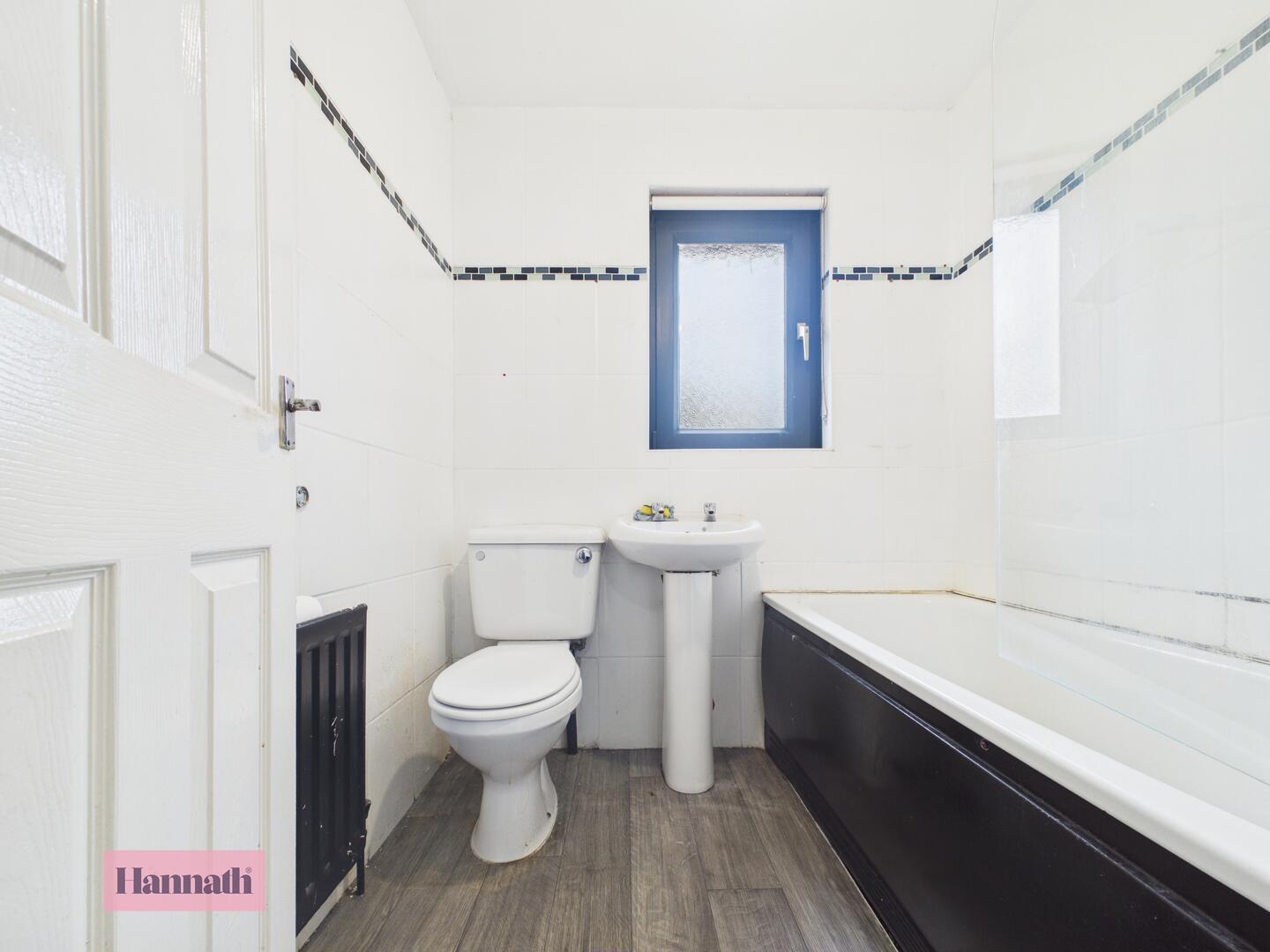 Electric shower over bath, wash hand basin, w.c., tiled walls, laminate flooring, radiator