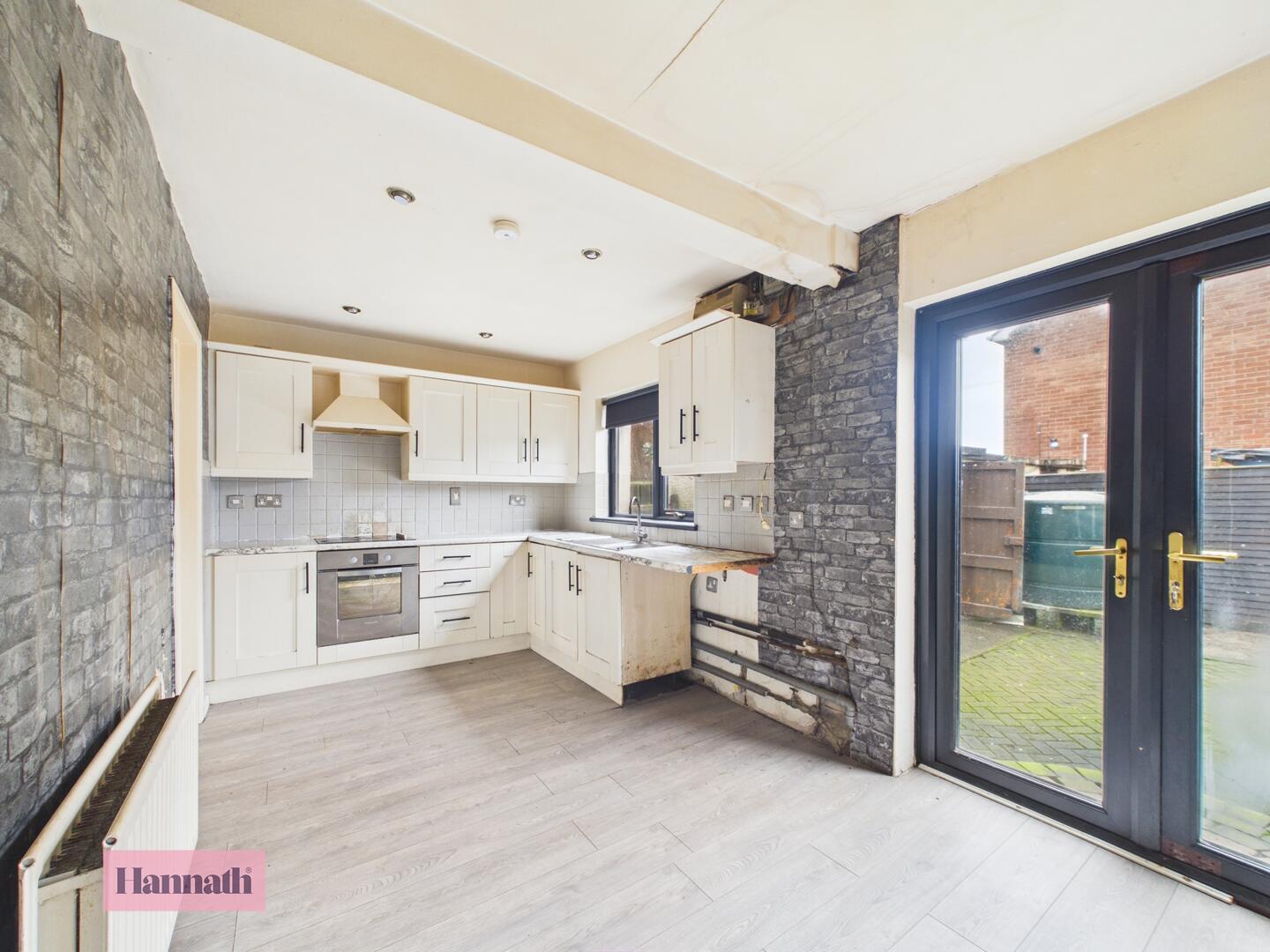 Range of units, wood laminate flooring, patio doors to rear, radiator