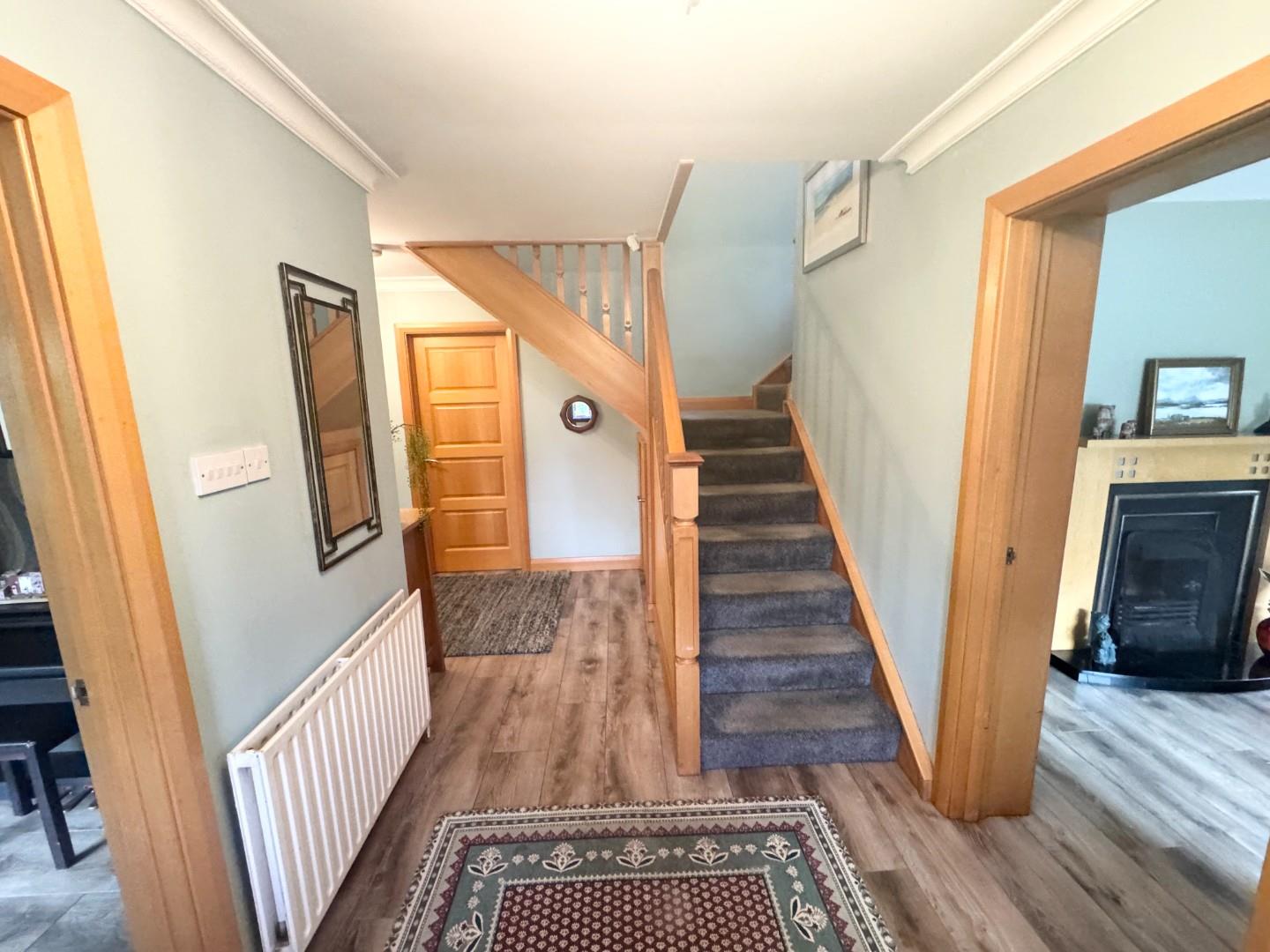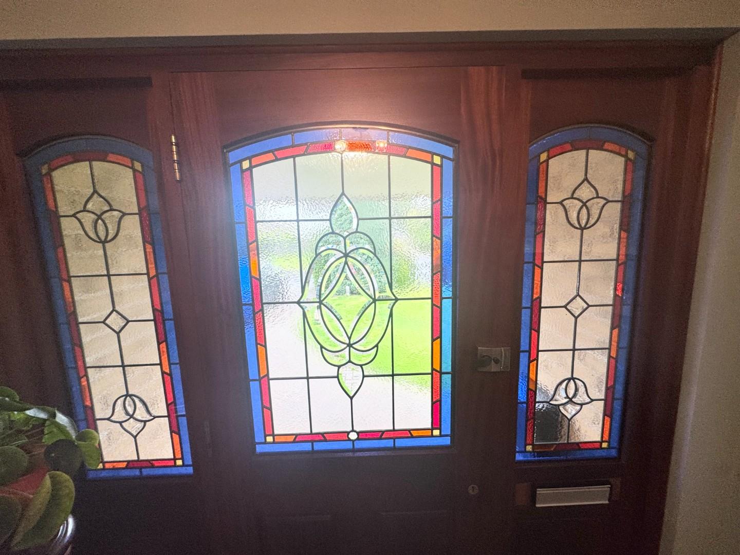 Lead glass design front door to spacious hallway with laminate flooring, under stairs storage and storage cupboard. Ceiling cornicing.