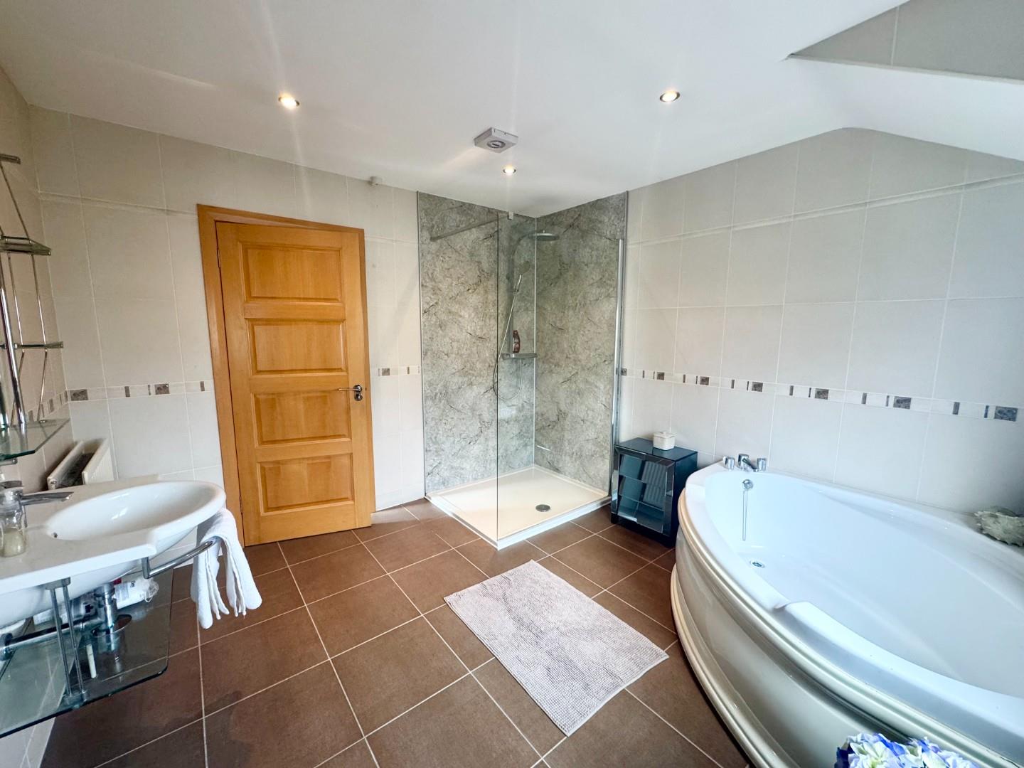 White suite with fully tiled wall and floor, LFWC, panel corner bath, wall mounted wash hand basin, large double walk in shower with rain drop shower head and detachable shower head. extractor and radiator.