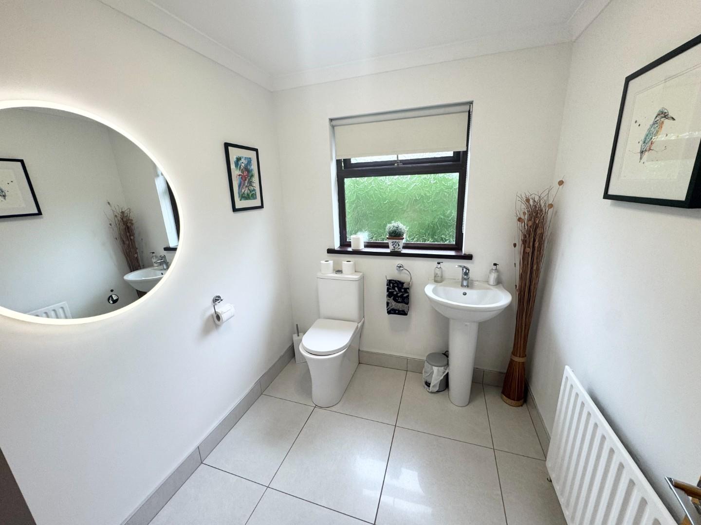 Modern suite consisting of LFWC, pedestal wash hand basin, fully tiled floor, radiator , fitted mirror with ring light.