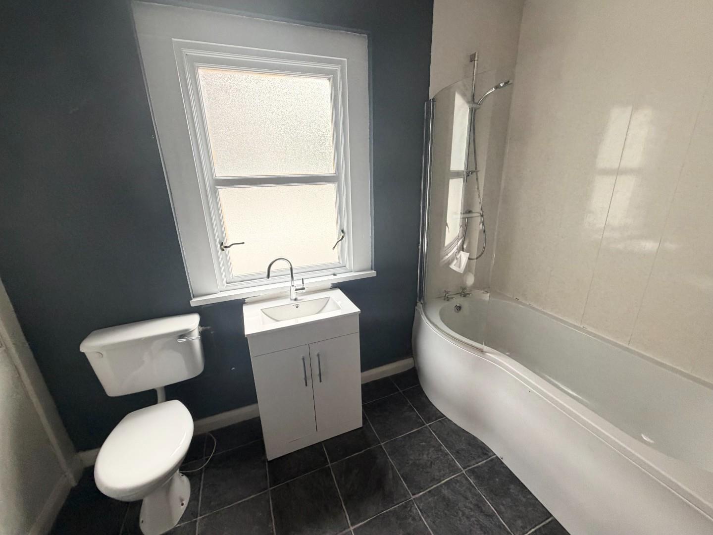 New bathroom with white suite , comprising of LFWC, wash hand basin with storage below. and P shaped bath with glass screen and shower above , fully tiled wall over bath and tiled floor.
