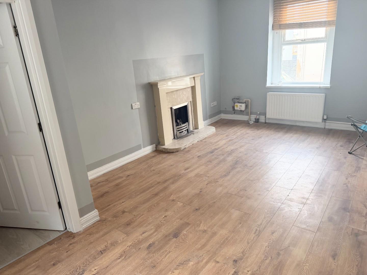 Spacious room with laminate flooring, open fire with sandstone surround and tiled hearth. Under stairs storage.