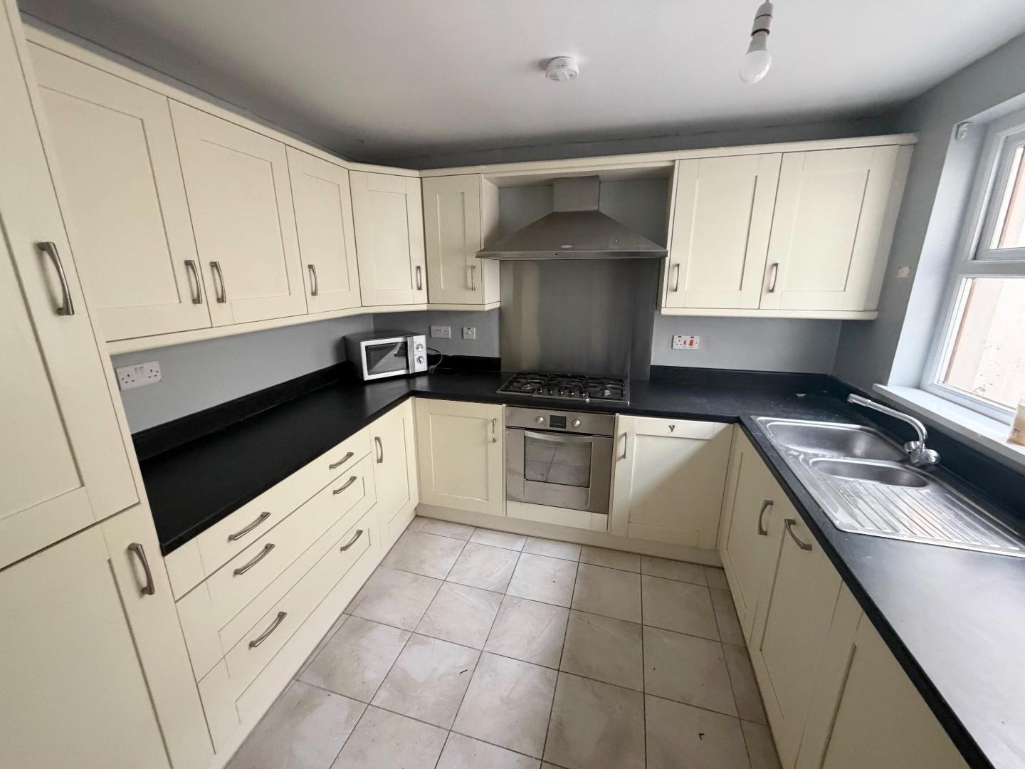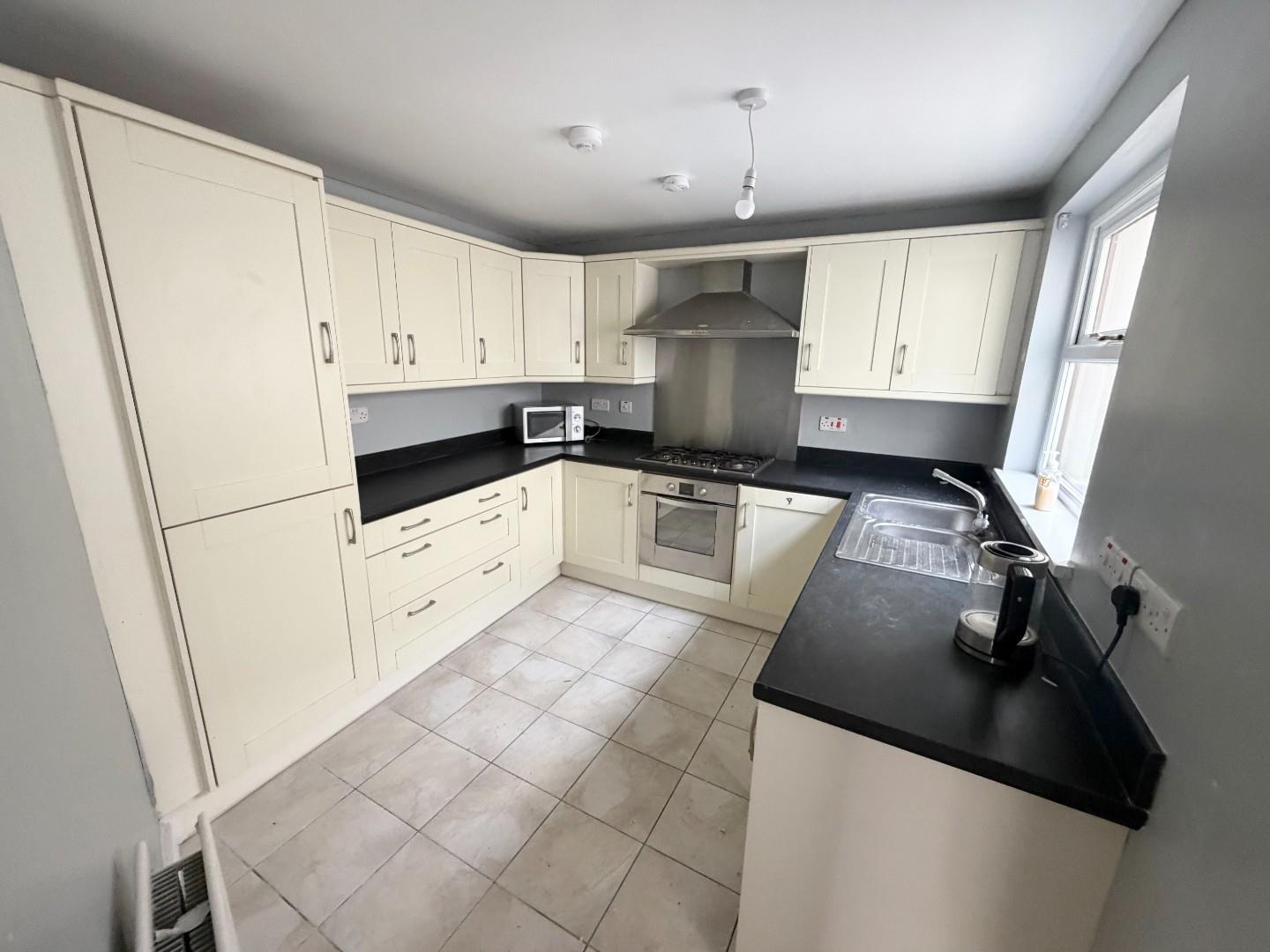 Modern kitchen with high and low level units, 11/2 stainless steel sink and drainer, integrated gas hob and oven with stainless steel splash back and extractor. integrated fridge freezer. Tiled floor door to rear yard.