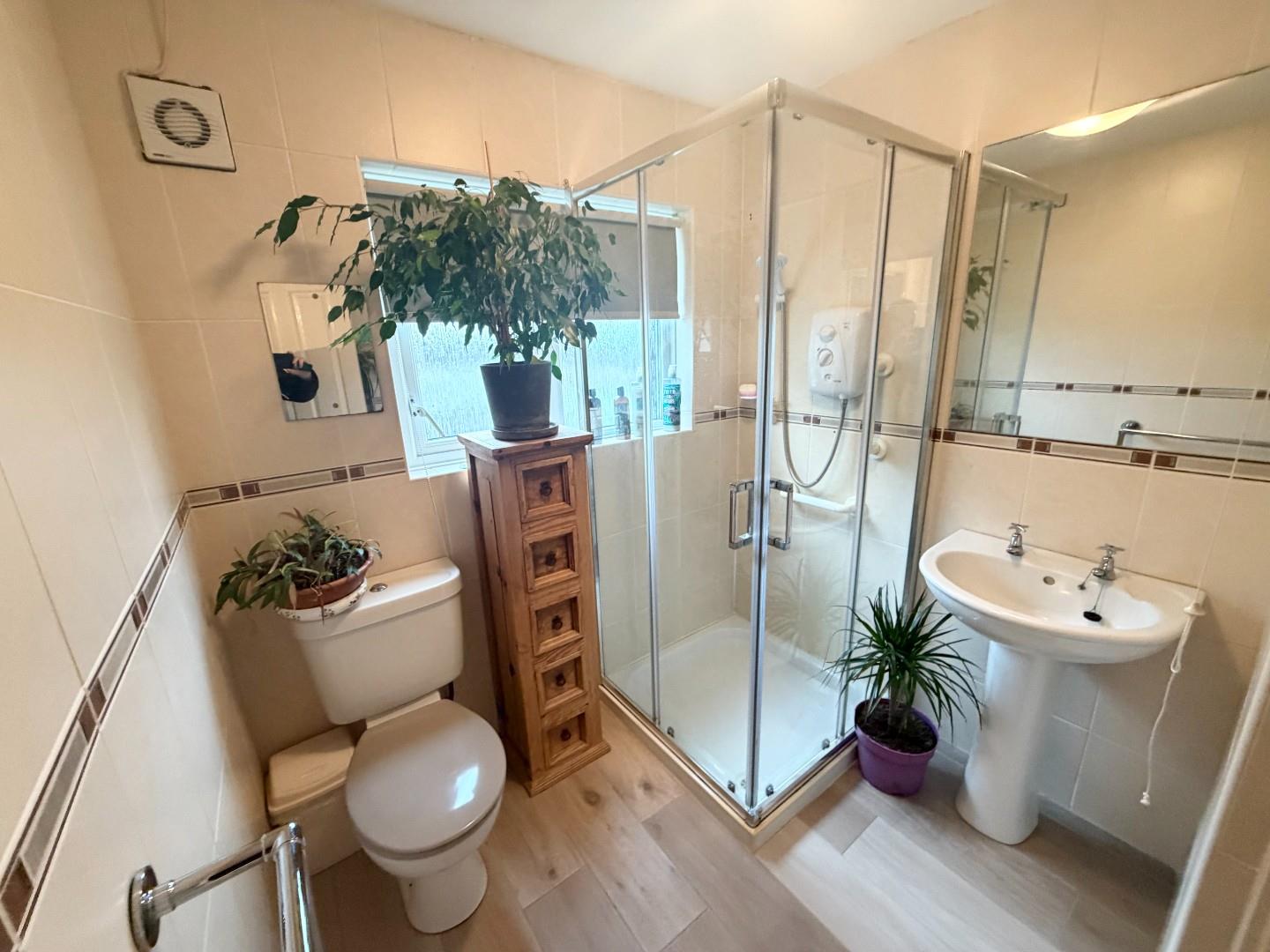 White suite with LFWC, pedestal wash hand basin, corner shower unit with glass doors and tiled wall and an electric shower, extractor fan, chrome towel rad, hot press shelved, tiled floor and fully tiled wall.
