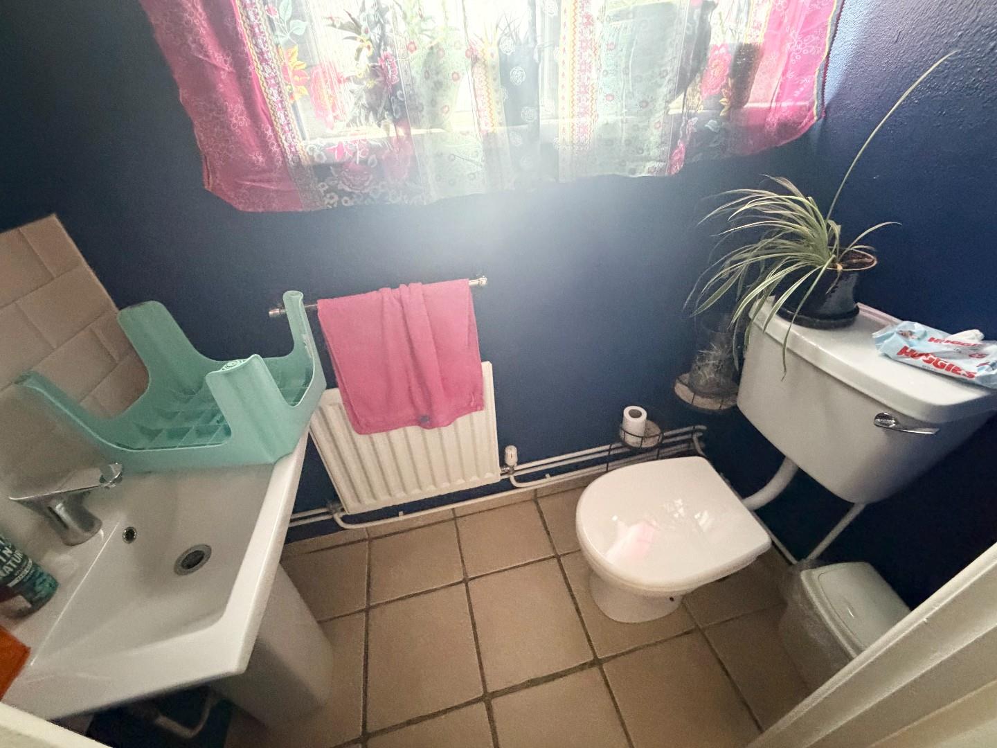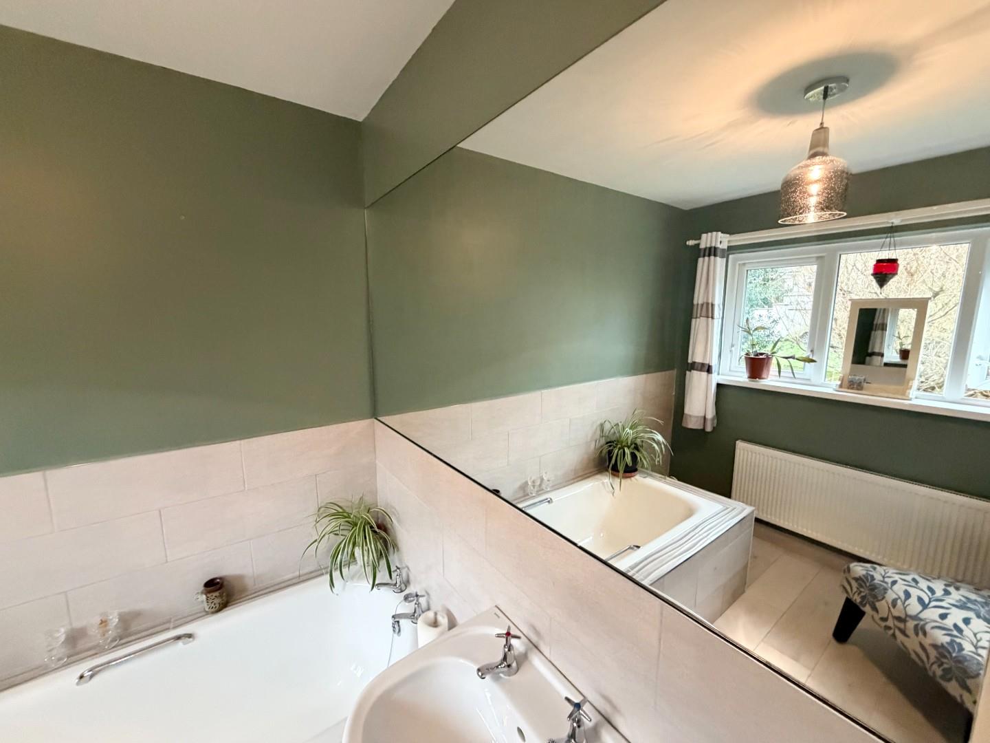 The second bathroom was newly installed to allow for a bath, it has a panel bath and pedestal wash hand basin, fully tiled floor and part tiled wall, and a storage space. large radiator.