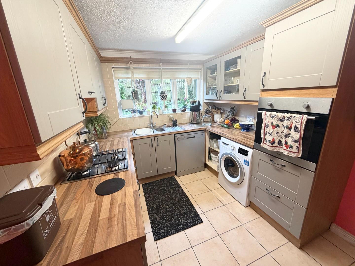 New kitchen with high and low level units, 11/2 stainless steel sink and drainer, plumbed for dishwasher and washing machine. electric oven and gas hob with extractor above, fully tiled floor part tiled wall.
